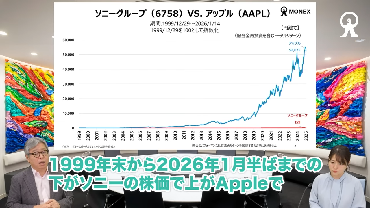 岡元:こちらのスライドには、1999年末から2026年1月半ばまでのソニーグループと、Appleの株価チャートを示しています。これらの企業を比較するのが適切かどうかは置いておいて、あくまで参考として見ていただければと思います。