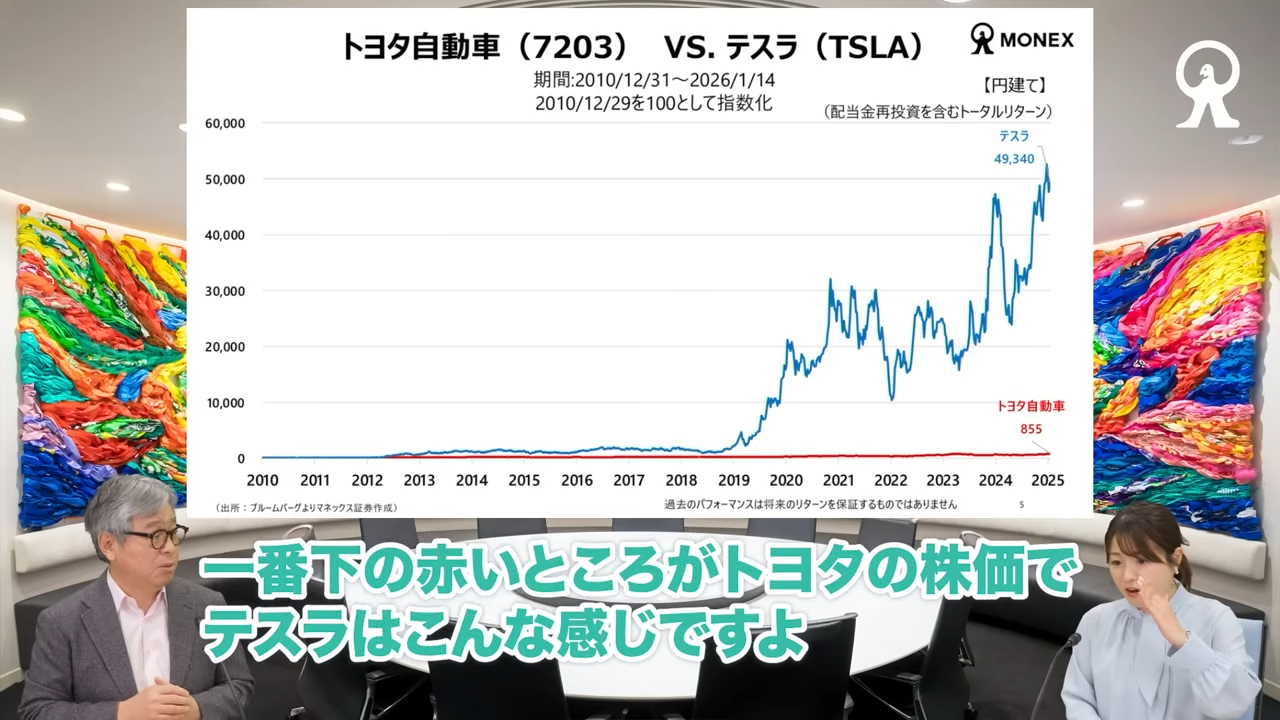岡元:こちらは、2010年末から2026年1月半ばまでの、トヨタとTeslaの株価チャートを比較したものです。スライドの赤い線がトヨタの株価で、青い線がTeslaです。ご覧のとおり、Teslaはすごい勢いで伸びています。