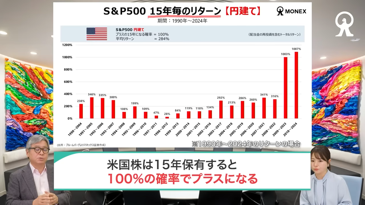 岡元:さらに言うと、最悪のタイミングで米国株を買ったとしても、15年保有すると100パーセントの確率でプラスになったというデータがあります。
