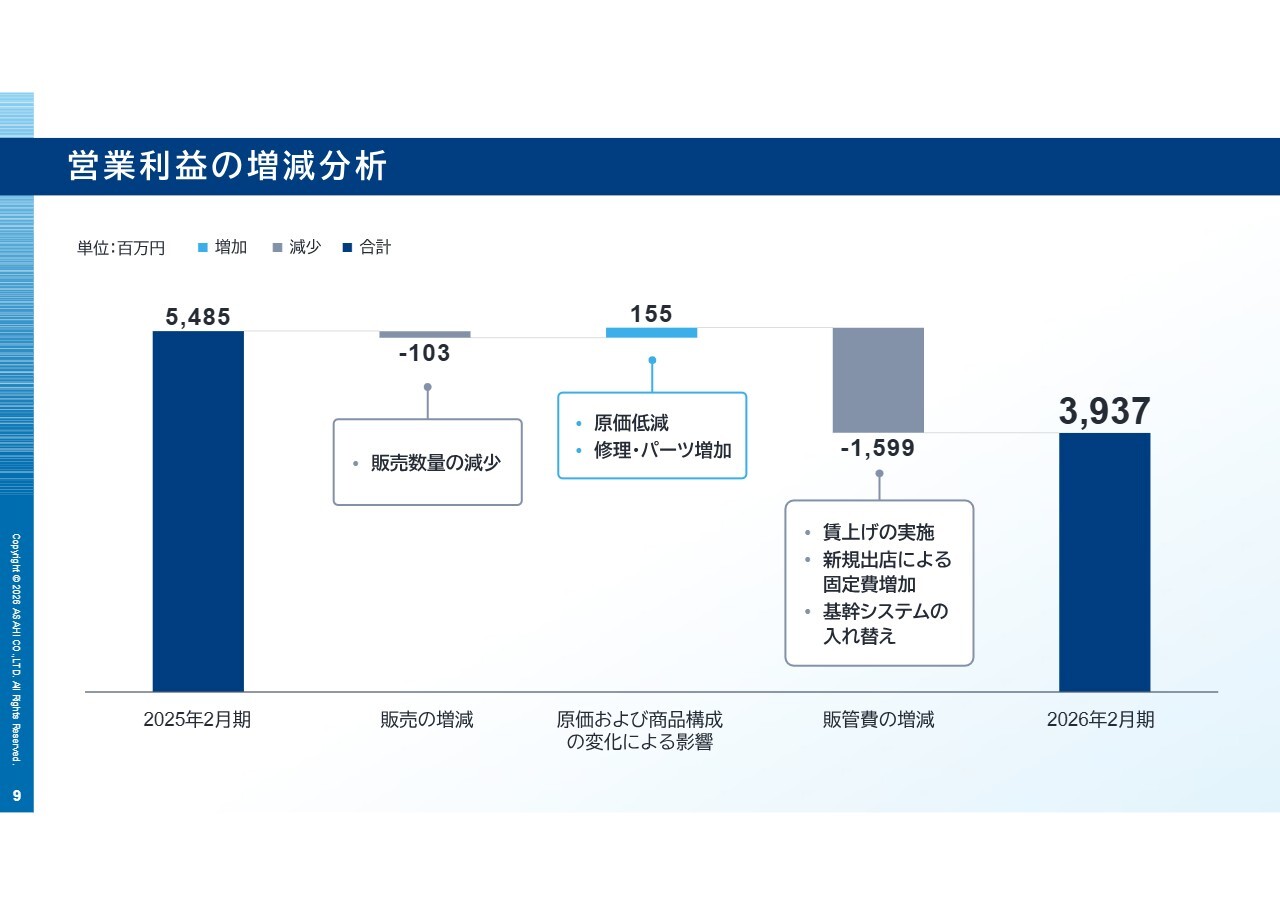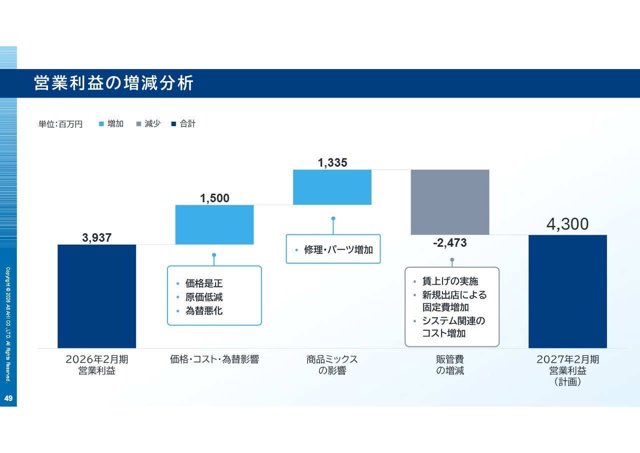 営業利益の増減要因についてご説明します。売上総利益では、円安の影響が悪化要因となる一方で、あさひブランドの原価低減や価格是正、収益性の高い修理やパーツ分野の伸長により増加する見通しです。