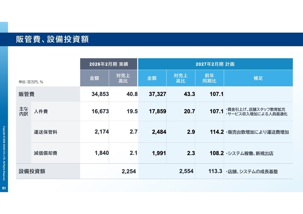 販管費全体は前年同期比107.1パーセントの約373億円、設備投資は店舗や成長基盤への投資を中心に約25億円を計画しています。