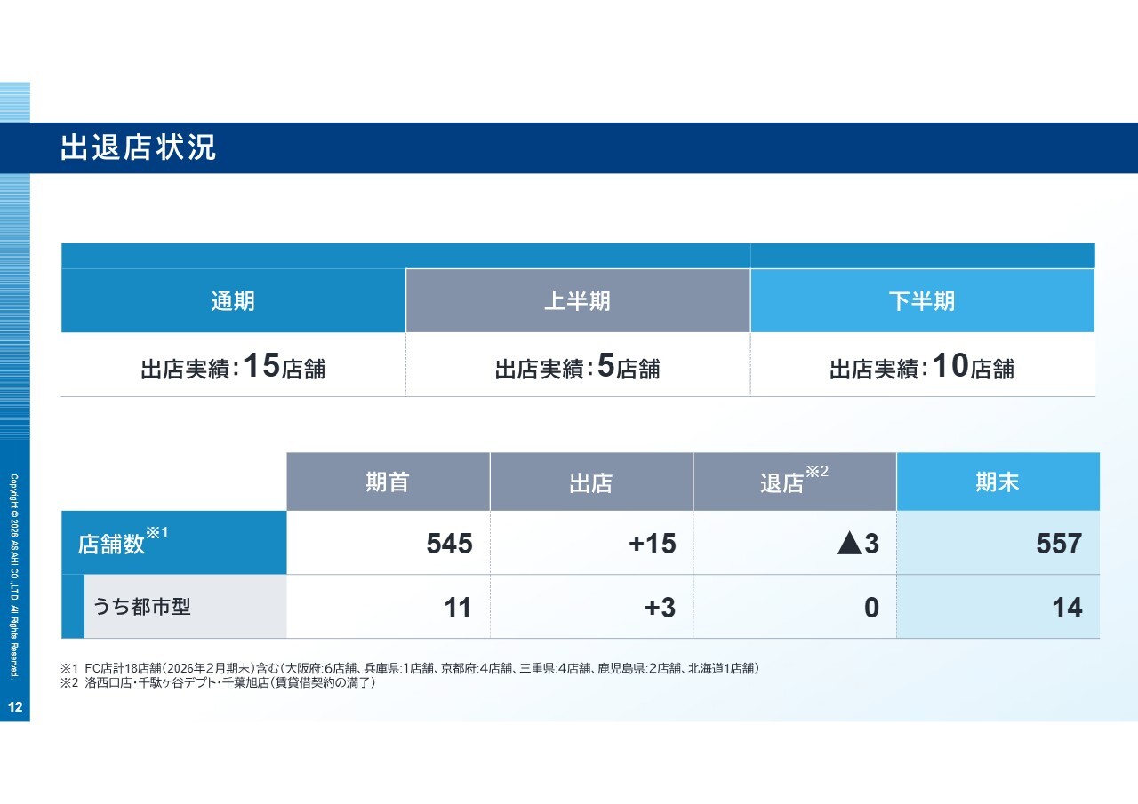 出退店については、新規で15店舗を出店し、3店舗は賃貸借契約の満了に伴い退店しました。その結果、直営店が539店舗、FC店が18店舗、合計で557店舗となりました。