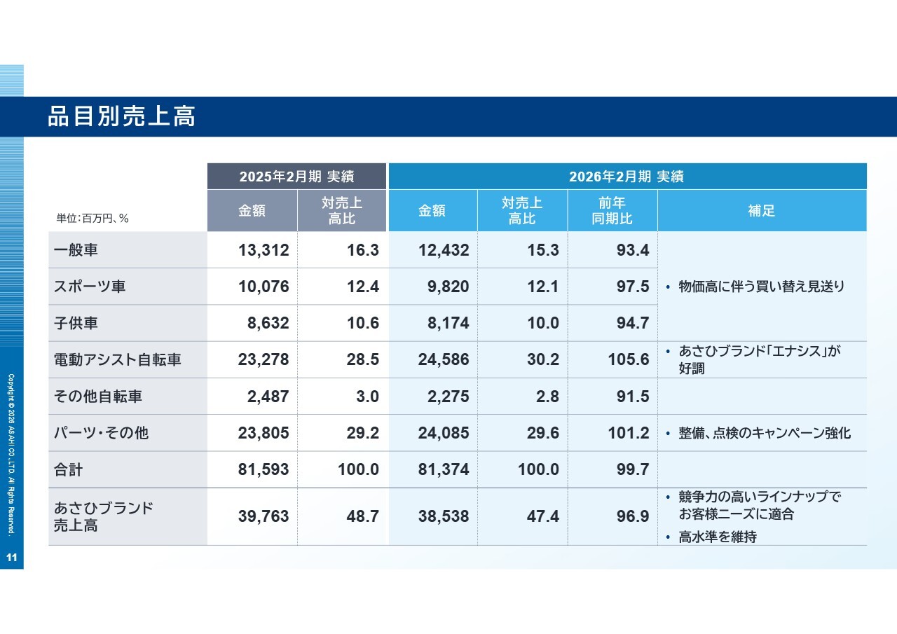 品目別売上高です。ポイントとして、電動アシスト自転車では前年同期比105.6パーセントとなっています。商品力の高いあさひブランド「エナシス」の販売が伸びたことで、売上高が増加しました。