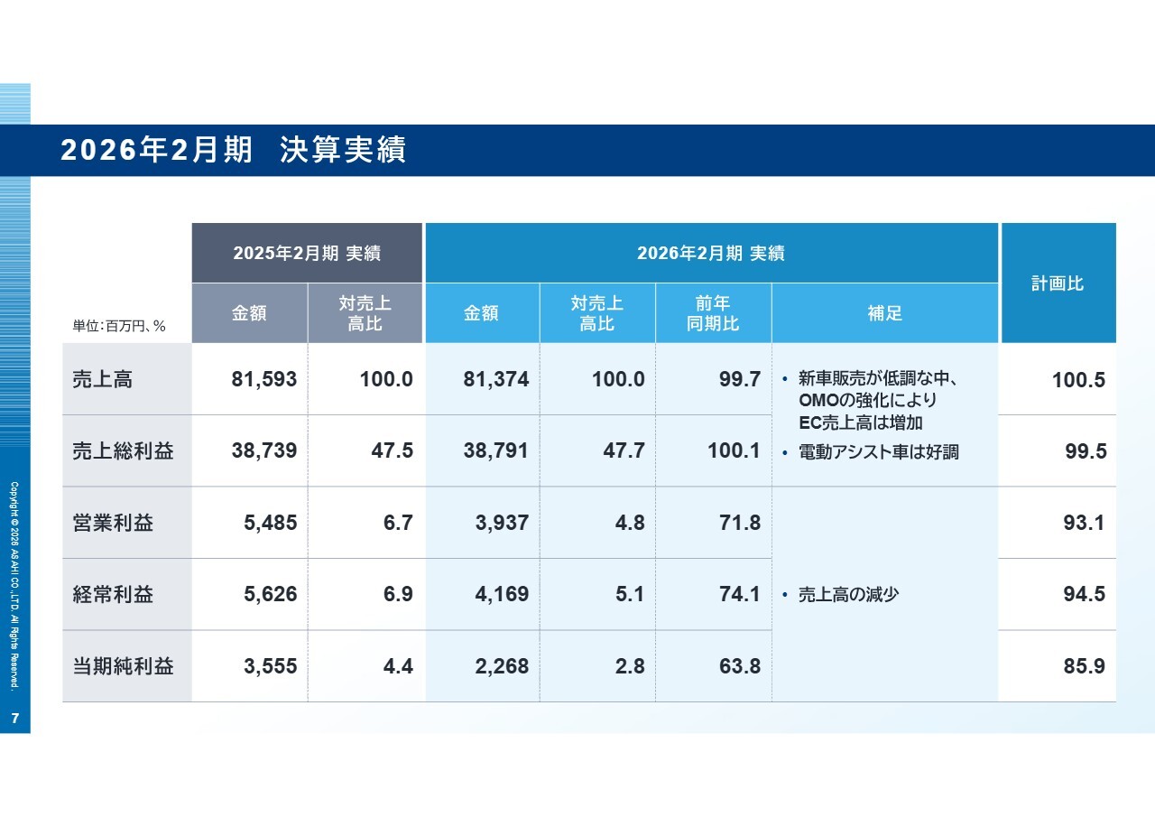 2026年2月期の決算実績については、スライドに記載のとおりです。