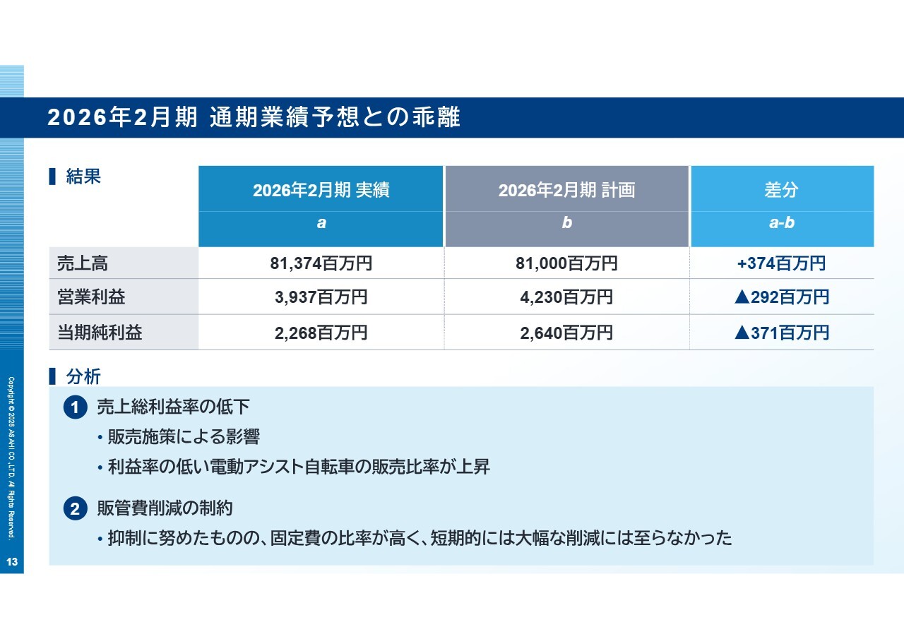 通期業績予想との乖離についてです。まず、売上高については、販売促進を強化したことで通期業績予想を上回りましたが、電動アシスト自転車の販売比率が上昇した結果、全体の売上総利益率は低下しました。