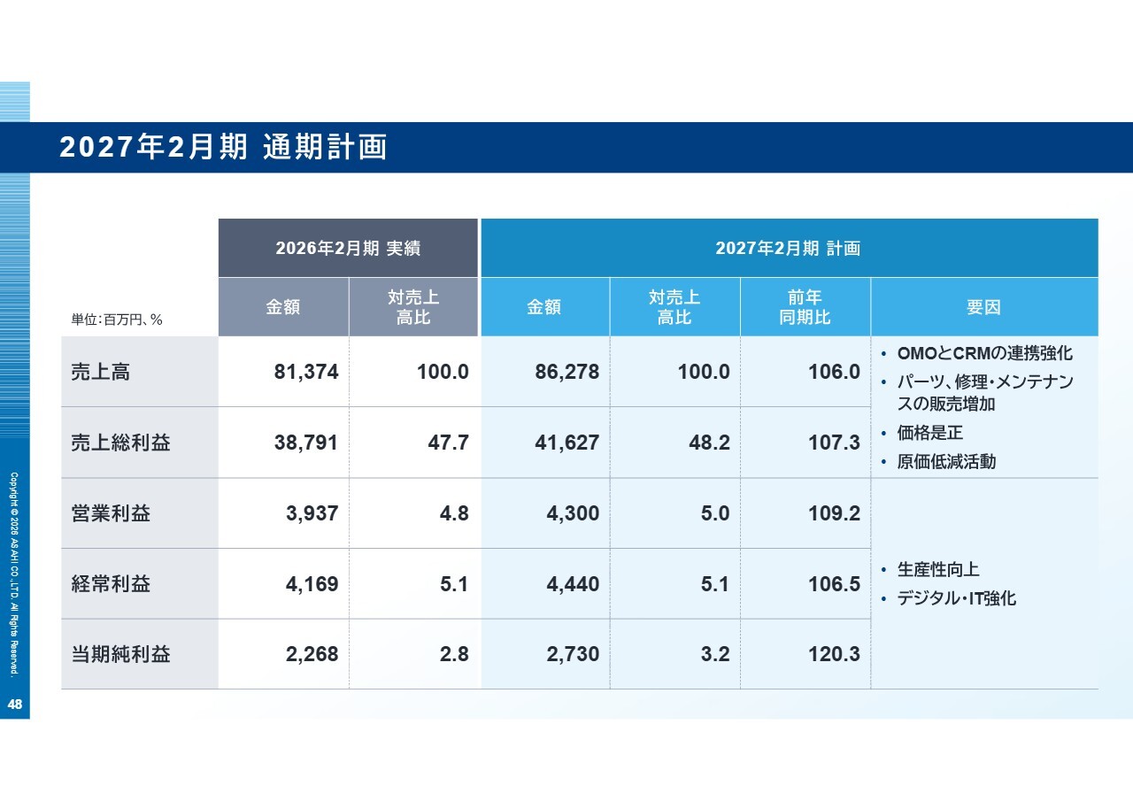 まず、売上高については前年同期比106パーセントの862億円を計画しています。また、売上総利益は売上高の増加に伴い、前年同期比107.3パーセントの416億円を見込んでいます。売上総利益率は、原価低減の取り組みや修理・メンテナンス、パーツの売上構成比増加に伴い、48.2パーセントを想定しています。