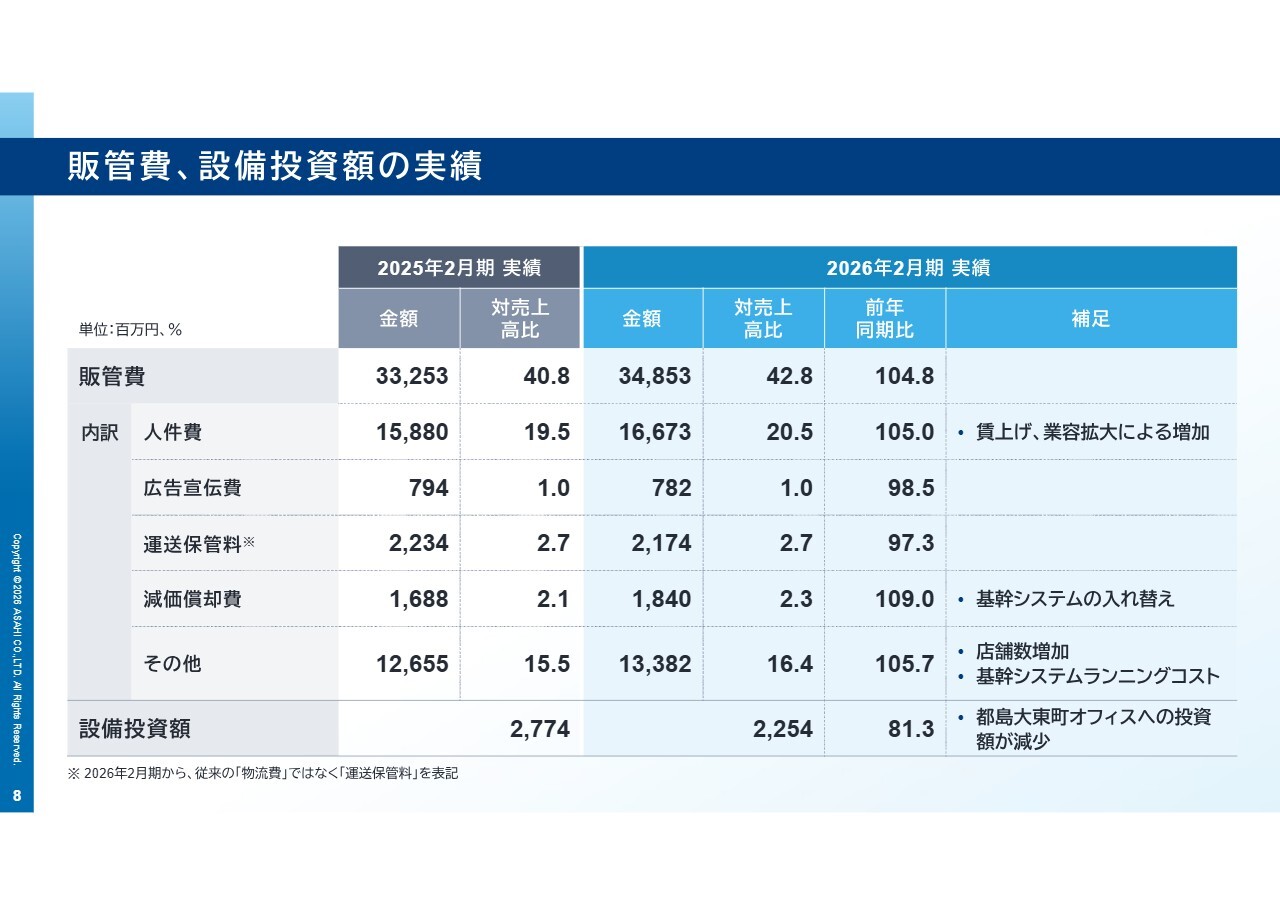 販管費および設備投資です。販管費は前年同期比104.8パーセントとなりました。主な内訳として、人件費では賃上げや業容拡大に伴う人員増加がありましたが、適正配置や生産性向上に取り組むことで、計画の前年同期比108.5パーセントに対し、実績は前年同期比105パーセントに抑えることができました。