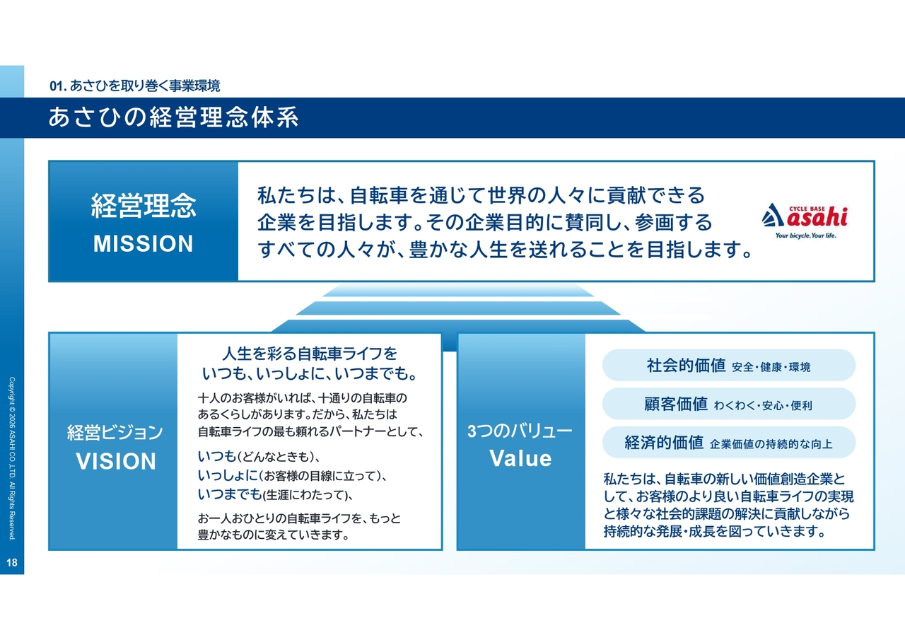 あさひの経営理念体系です。当社は一貫して、自転車を「売る」ことだけではなく、自転車のある生活そのものを支える存在でありたいと考えてきました。