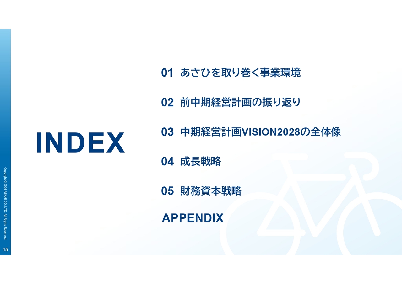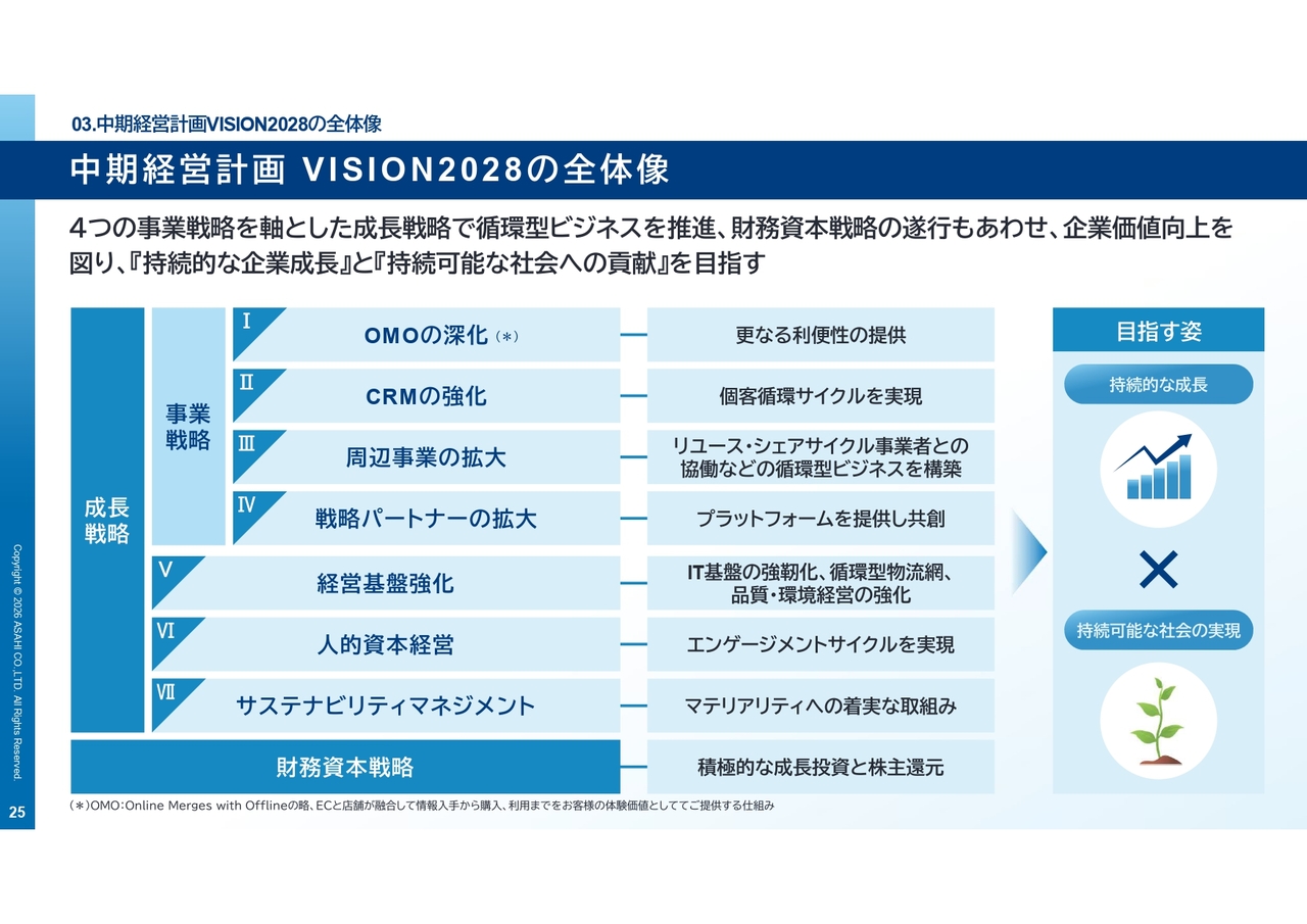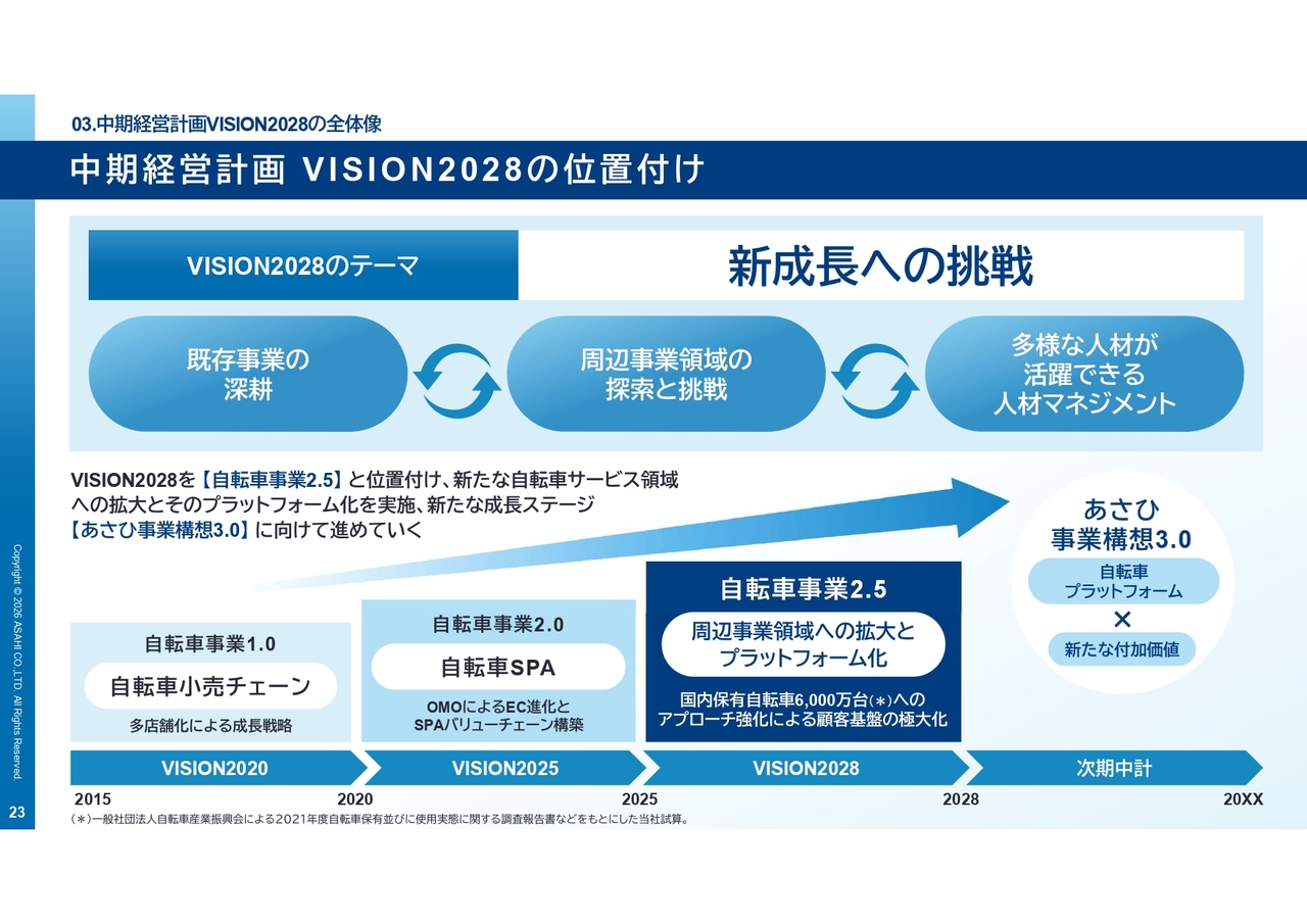 スライドは、当社の中期経営計画を時間軸で整理したものです。「VISION2028」では、「新成長への挑戦」をテーマとして掲げ、「自転車事業2.5」とし、「あさひ事業構想3.0」への移行期と位置付けています。