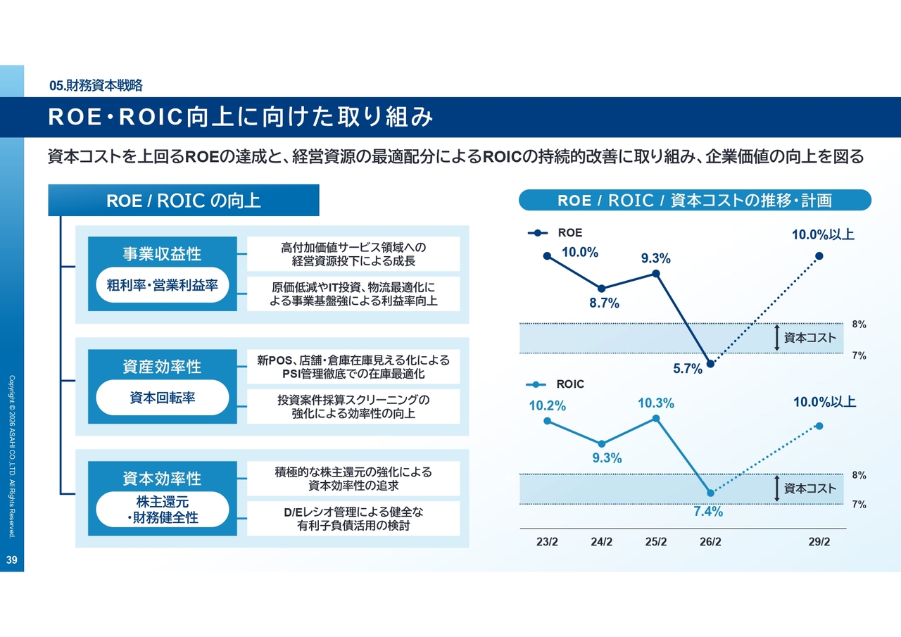 また、ROEやROICといった資本効率指標に関しても、成長投資と資本効率の両立を意識しながら、企業価値の向上を目指します。