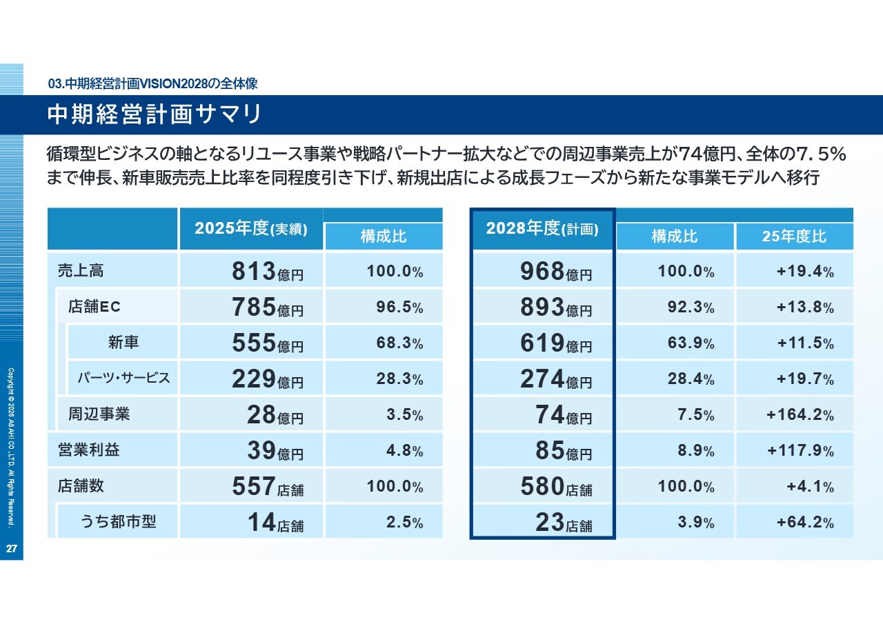 スライドは、2025年度の実績と2028年度の計画を並べたサマリです。「VISION2028」で目指しているのは、単純な売上規模の拡大ではありません。新車販売の比率を抑えながら、パーツ・サービスや周辺事業の構成比が高まっていることがわかります。