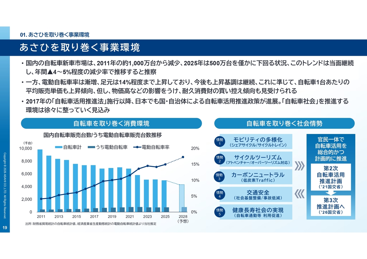 それではまず、あさひを取り巻く事業環境について整理します。本パートでは、自転車業界はどうなっているのか、その中で当社が何を前提に中期経営計画を立てたのかを共有します。後ほどご説明する「VISION2028」は、この環境認識を前提に設計しています。