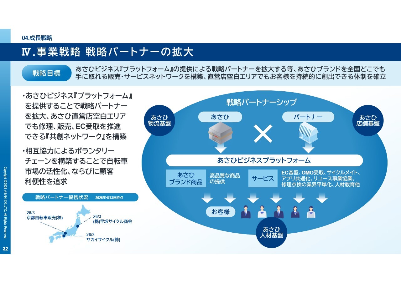 加えて、最近では建築コストがかなり高騰しており、地代家賃などの環境も非常に高止まりしています。そのため、自社で新店舗を出店するだけでなく、本日ご説明したパートナーとの協業や卸先との連携をしっかり図ることにより、あさひブランドの拡大や売上の拡大も十分に期待できると考えています。