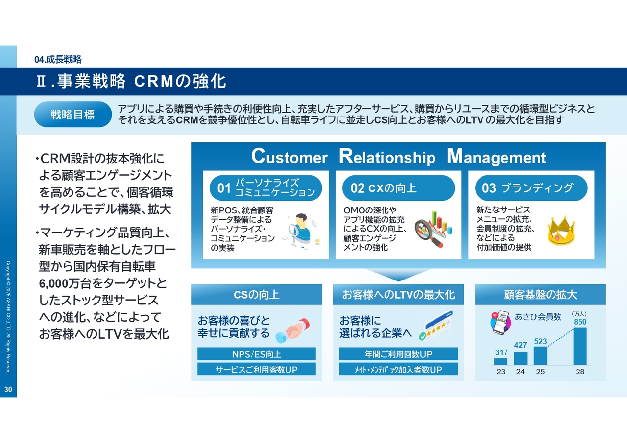 次に、CRMの強化(お客さまとの関係性強化)についてです。「VISION2028」では、新車販売を起点としたフロー型ビジネスから、国内保有自転車約6,000万台を対象とするストック型サービスへの進化を目指します。
