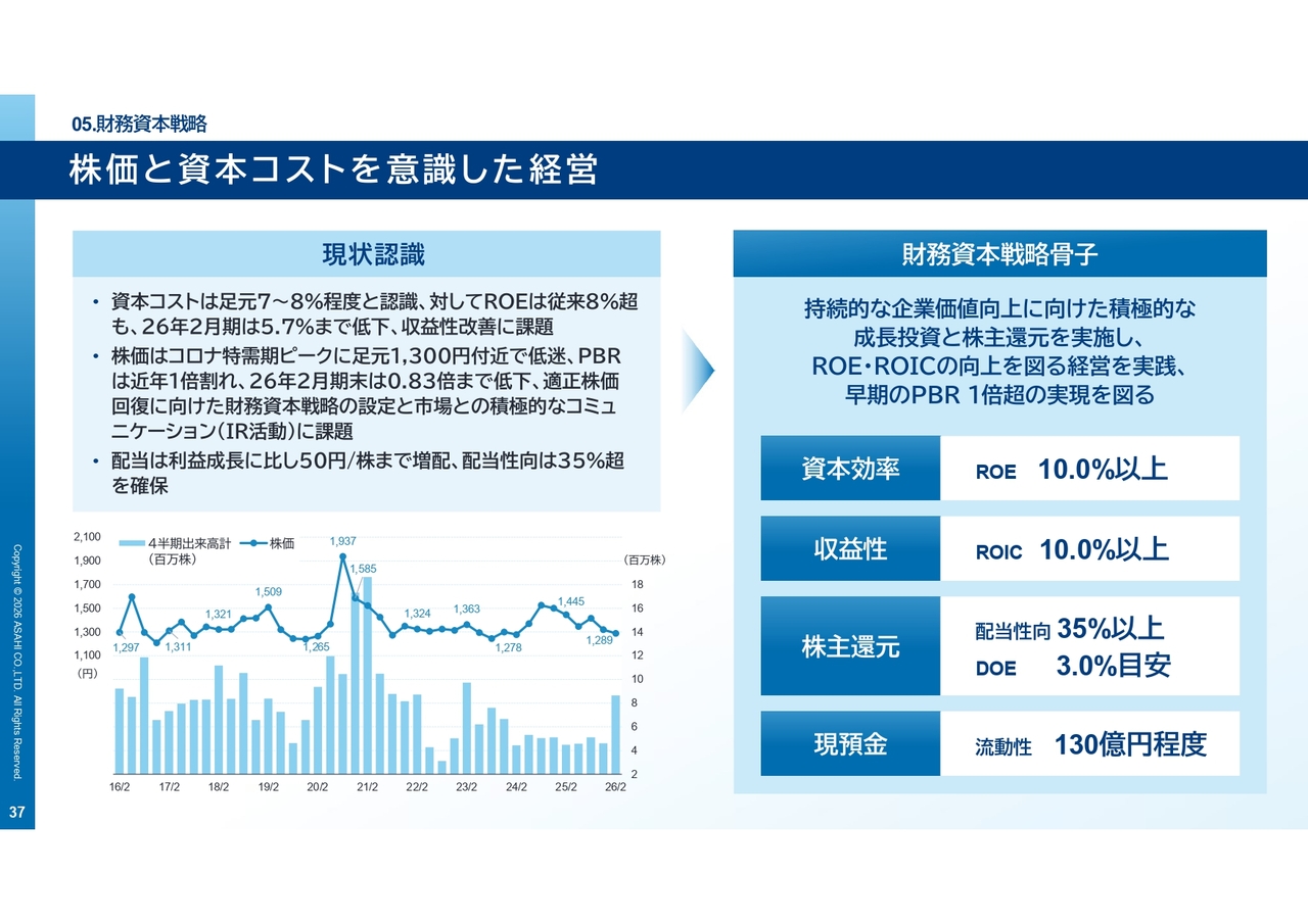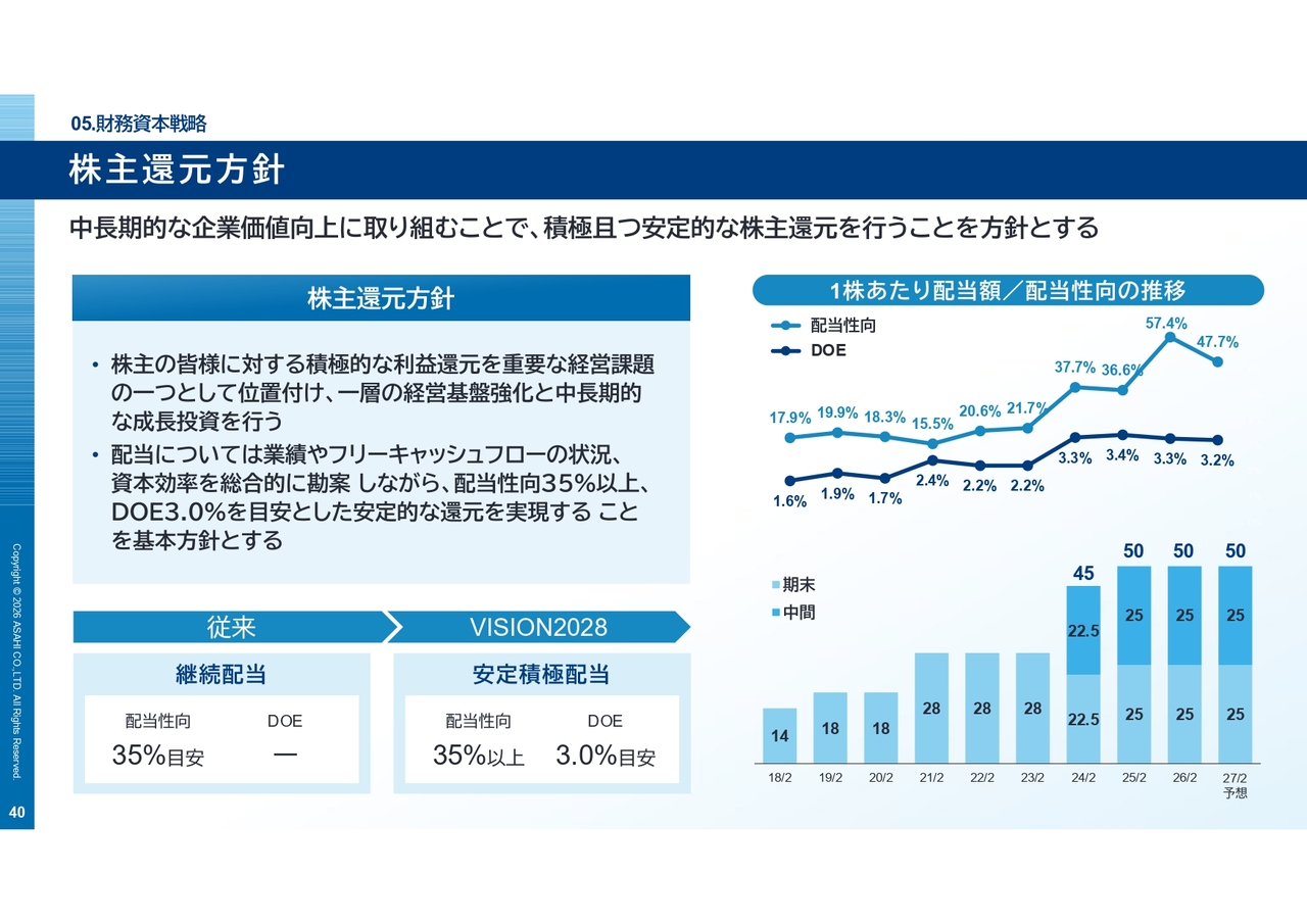 「VISION2028」では、配当性向35パーセント以上、DOE3パーセントを目安とした還元を実施していきます。成長投資と株主還元を両立させ、市場との対話を重ねながら、早期のPBR1倍超の実現を目指していきます。