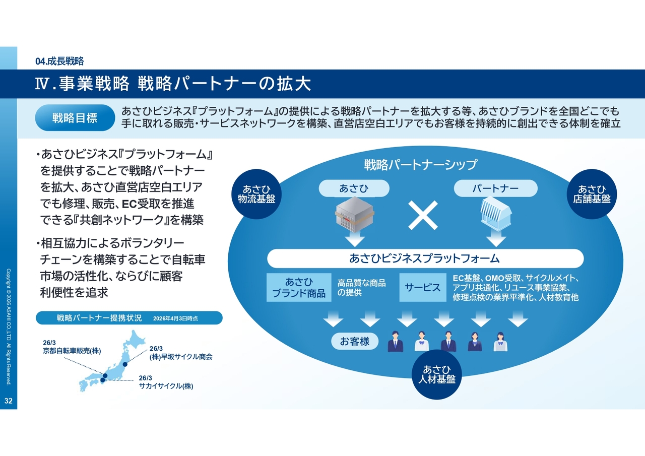 「あさひビジネスプラットフォーム」を協業先に提供することで、直営店に加え、あさひの出店空白エリアの全国の卸先・販売店と、商品やサービス、EC受取推進、アフターサービスなどの「共創ネットワーク」を構築していきます。