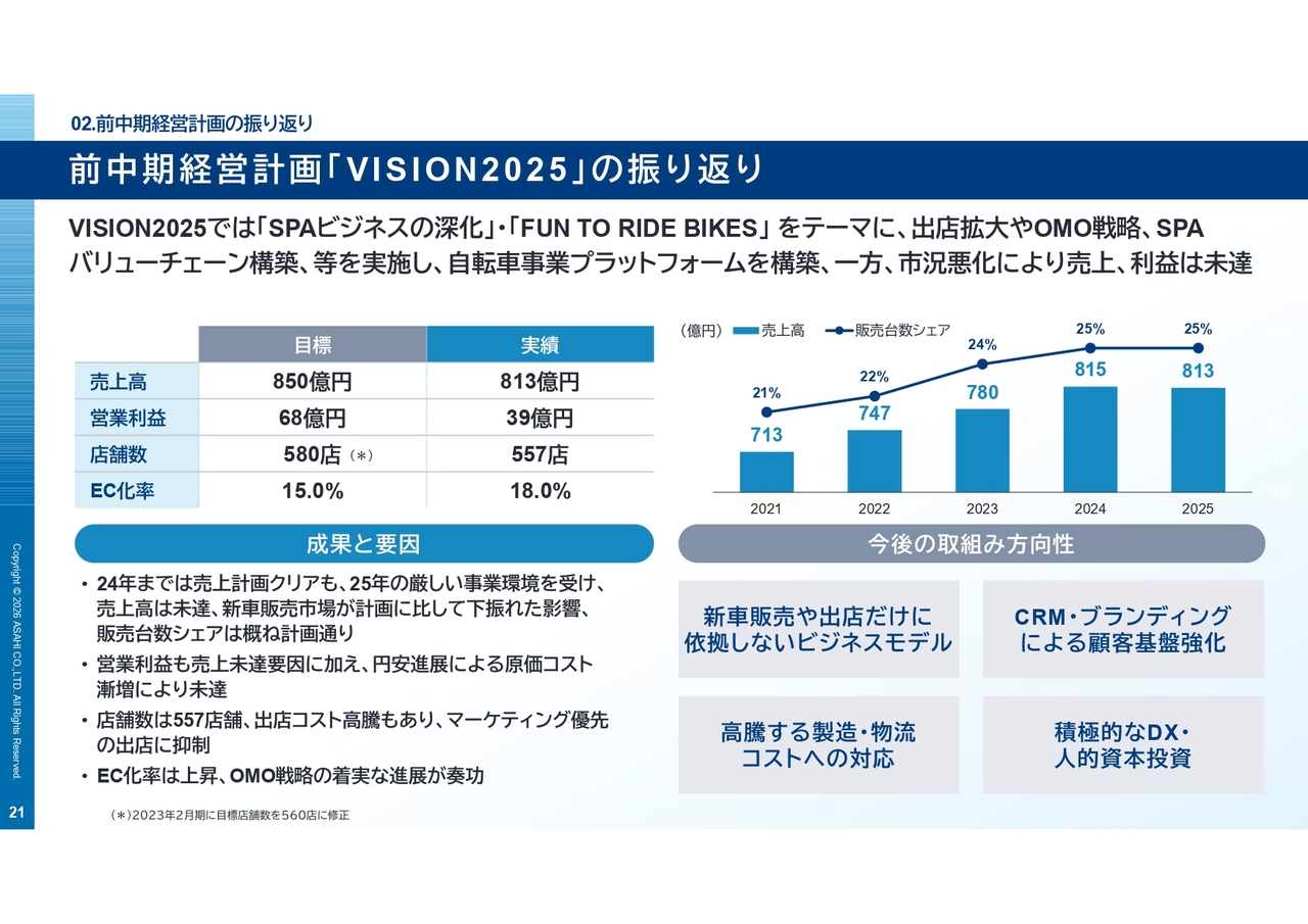 前中期経営計画「VISION2025」では、新規出店やECの融合、OMO戦略、物流基盤、SPAの高度化といった経営基盤の確立など、一定の成果はありましたが、売上・利益ともに目標未達となりました。