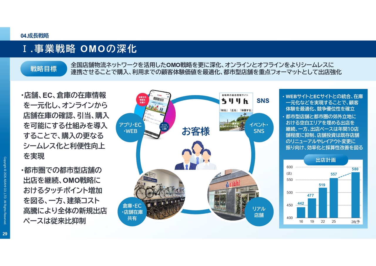 まず、成長戦略の起点となるのがOMO戦略の深化です。「VISION2028」では、店舗、EC、倉庫の在庫情報を一元化し、オンラインとオフラインをよりシームレスにつなげていきます。