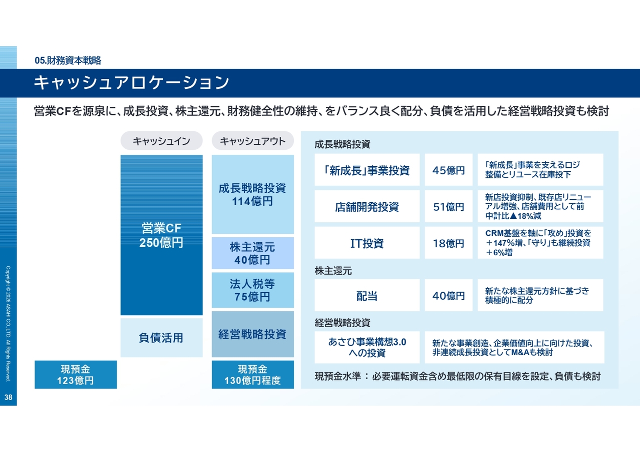 「VISION2028」では、営業キャッシュフローを成長投資と株主還元にバランスよく配分します。成長戦略投資としては、既存店舗のリニューアルや、リユース事業を支える物流・サポートセンター、IT基盤への投資を行います。