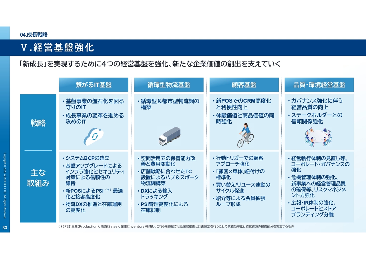 これらの戦略を支えるため、IT、物流、ガバナンスといった経営基盤の強化を進めます。「守りのIT」と「攻めのIT」を両立させ、安定した事業運営と成長を同時に実現します。