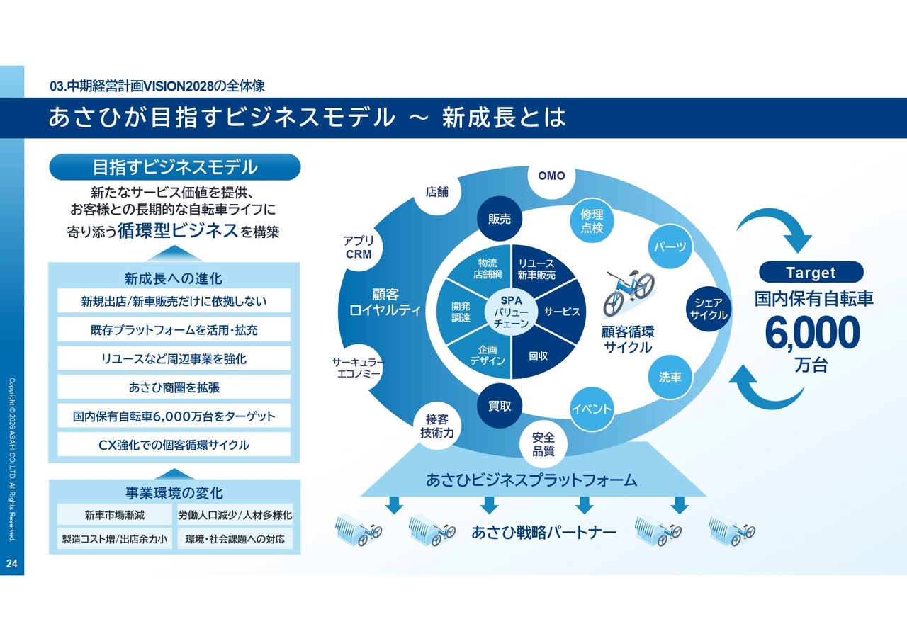 こうした反省を踏まえ、「VISION2028」では、成長の前提を、これまでの新規出店と新車を売ることで成長する会社から、国内に保有されている約6,000万台の自転車を起点にお客さまと長期的につながり、「サービスを軸」とした価値を生み続ける会社へと転換していきます。