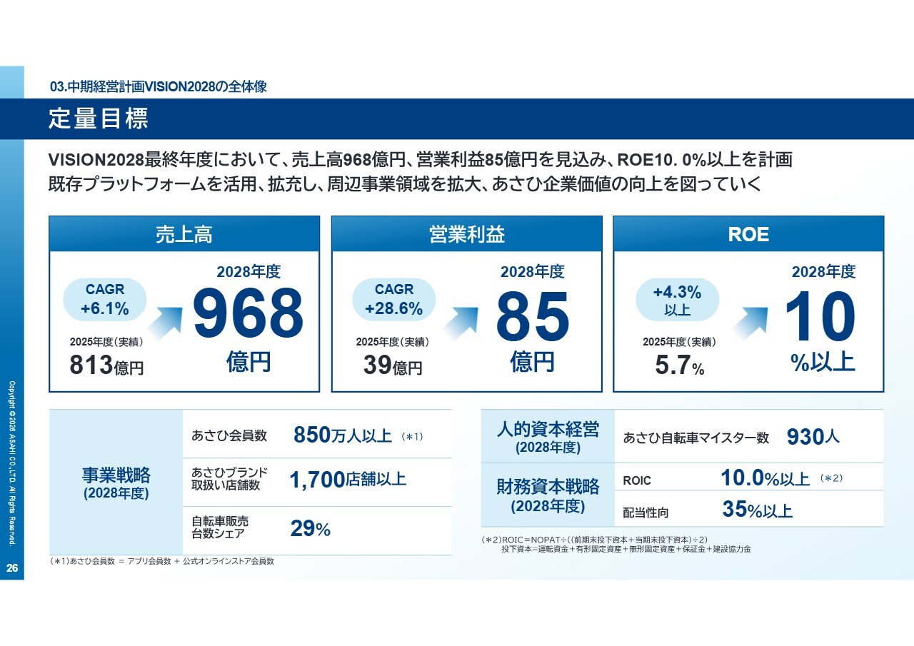 その結果として、「VISION2028」最終年度には、売上高968億円、営業利益85億円、ROE10パーセント以上を計画しています。