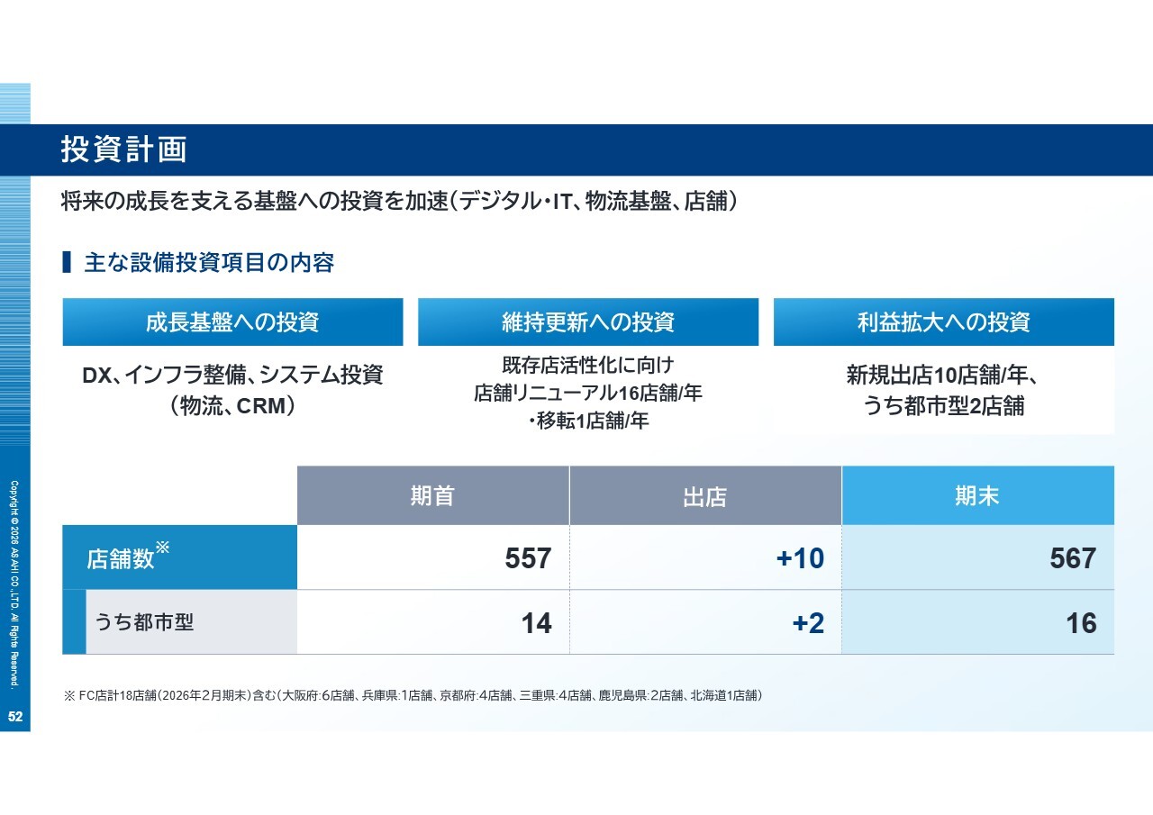 また、新規出店は抑制しつつ、既存店舗のリニューアルや都市型店舗の展開を進め、効率と採算性の改善を図ります。