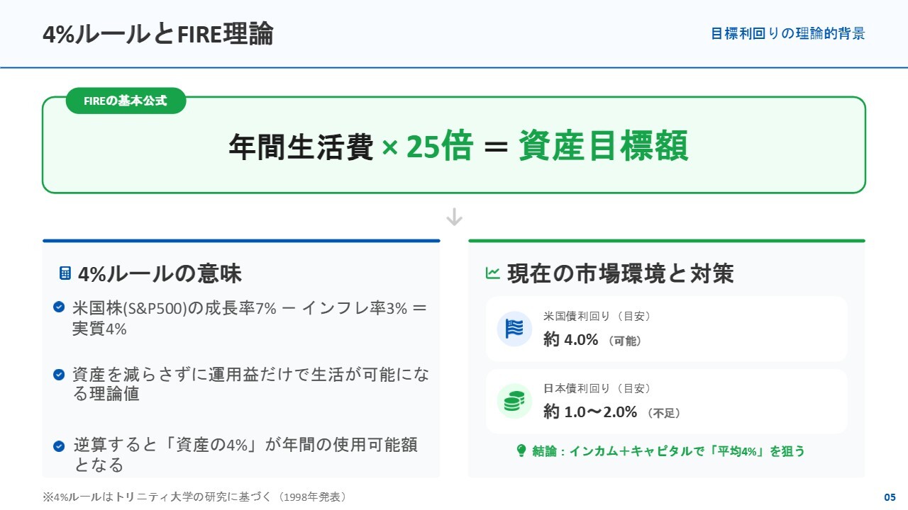 次に、FIRE理論(Financial Independence, Retire Early)として知られる「4パーセントルール」に基づいた利回りの設定についてご説明します。また、ポートフォリオ構築時に基本となる、リターンや利回りの設定の考え方についてもお話しします。