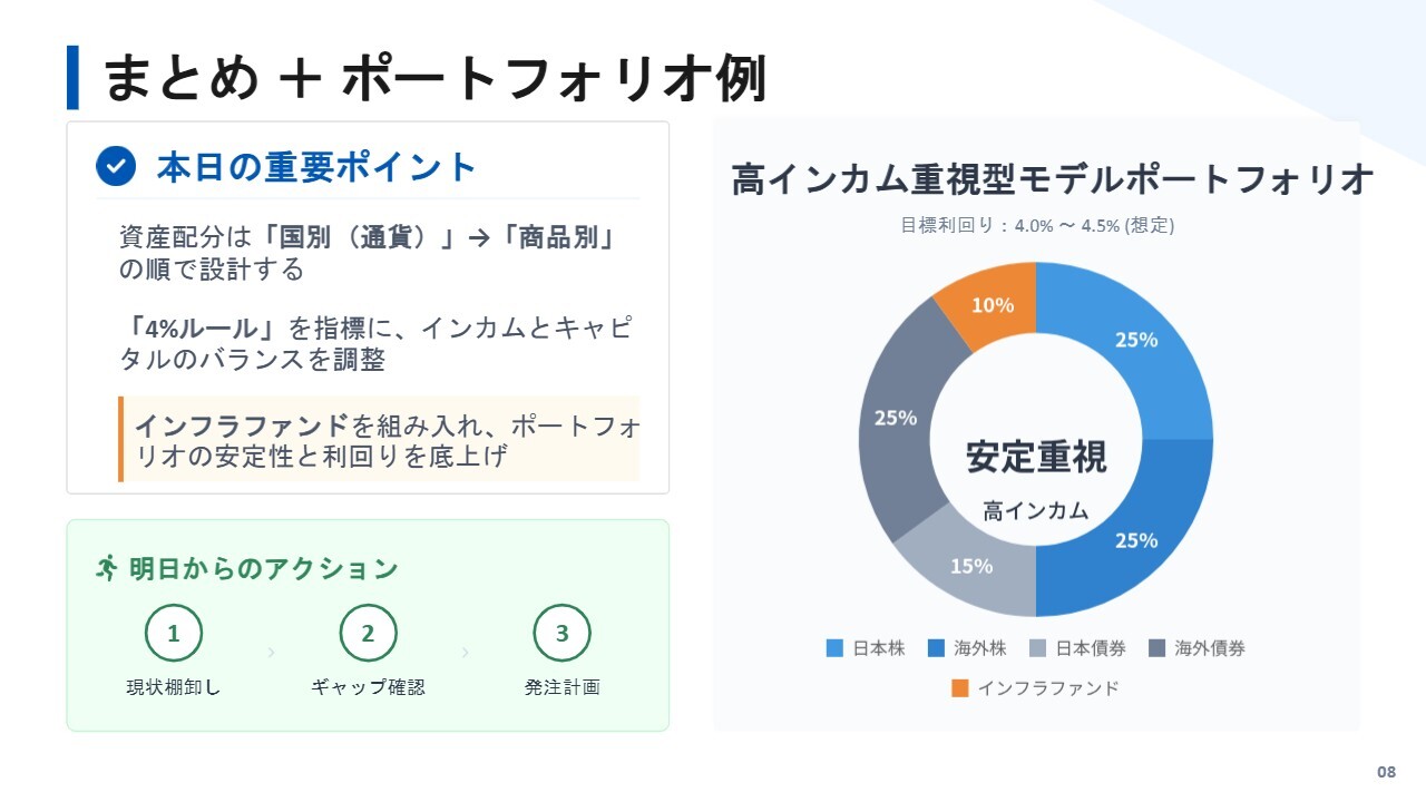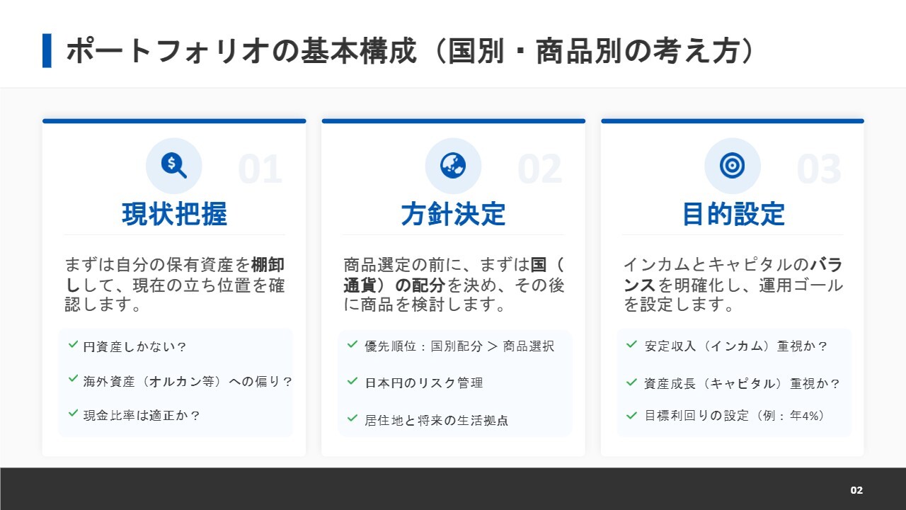 まずは日本および海外の配分を決定し、その後商品を選択するという流れが最もよいと考えています。また、積極的に運用したい場合は、ポートフォリオを分けることを検討してもよいでしょう。口座ごとに運用することで混乱を防ぐことができます。加えて、インカムとキャピタルのバランスを決めることも重要です。