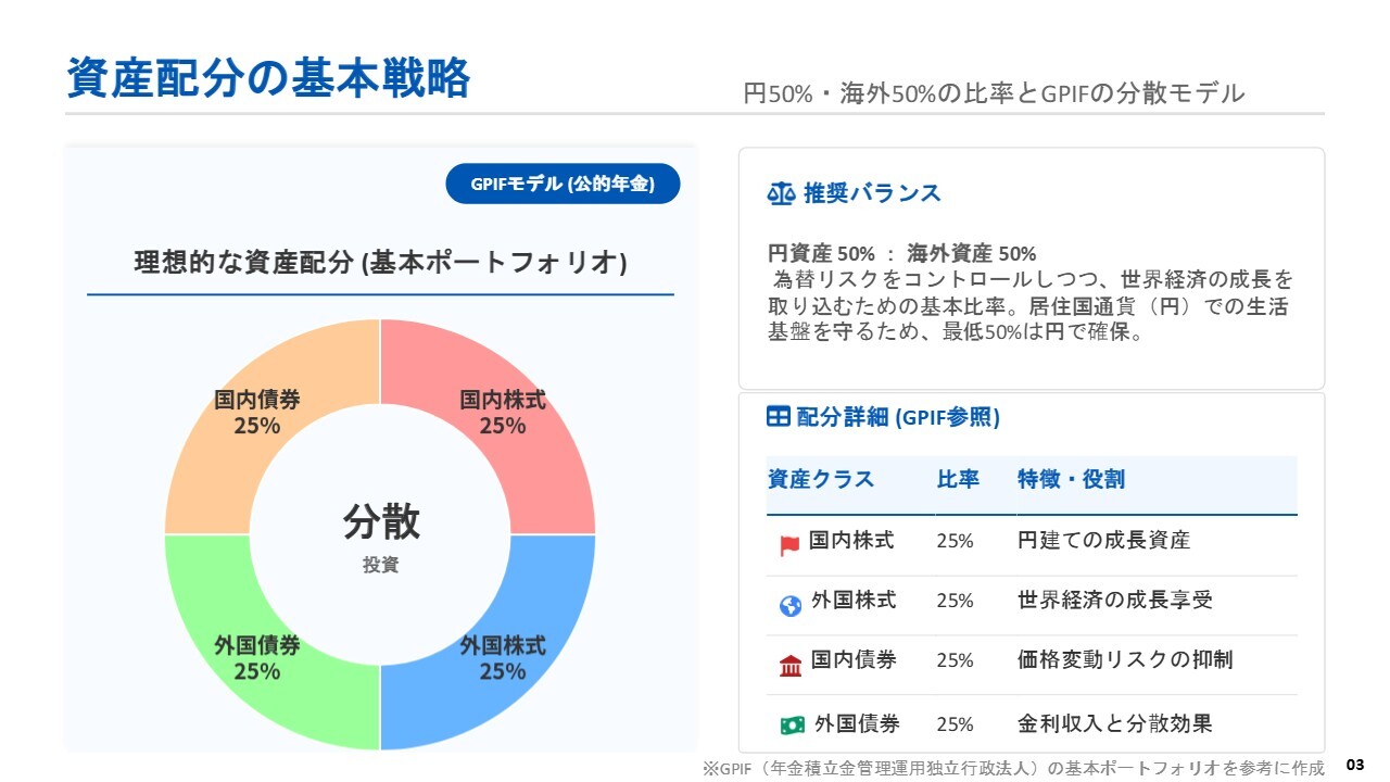 スライドの「理想的な資産配分」は、みなさまの年金を運用しているGPIF(年金積立金管理運用独立行政法人)のポートフォリオです。国内と海外を半分ずつ、債券と株式も半分ずつの構成となっています。