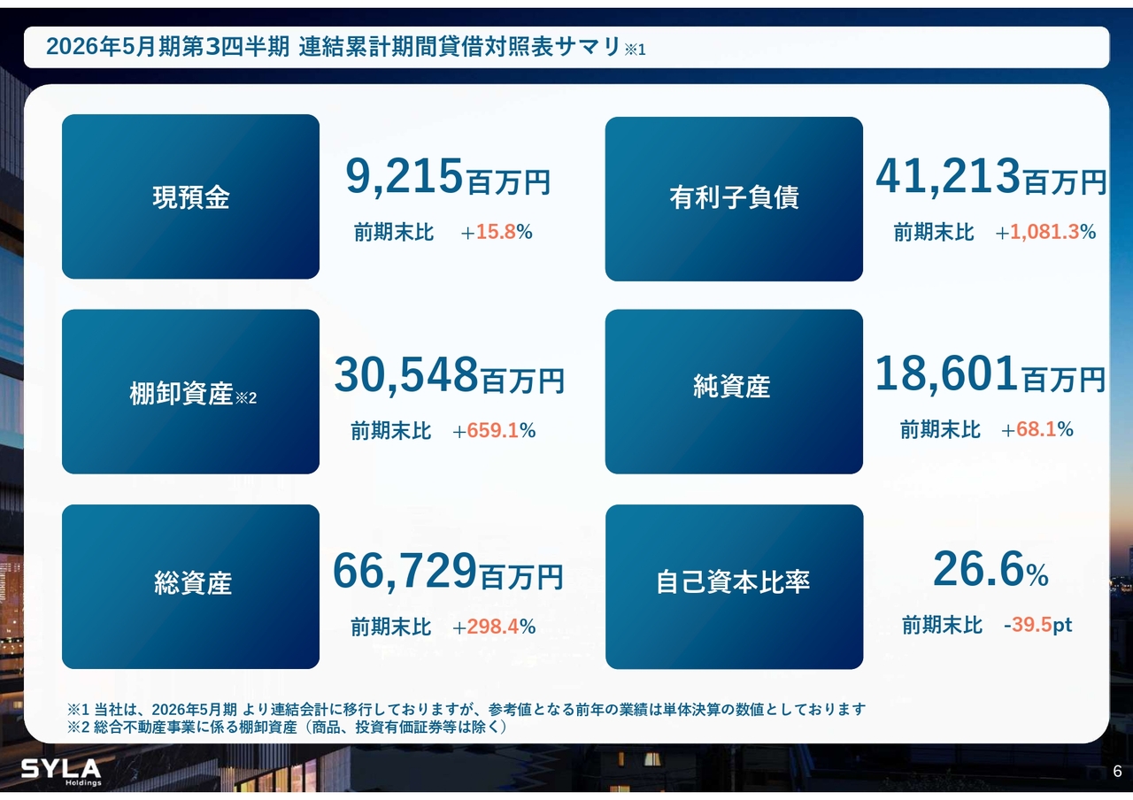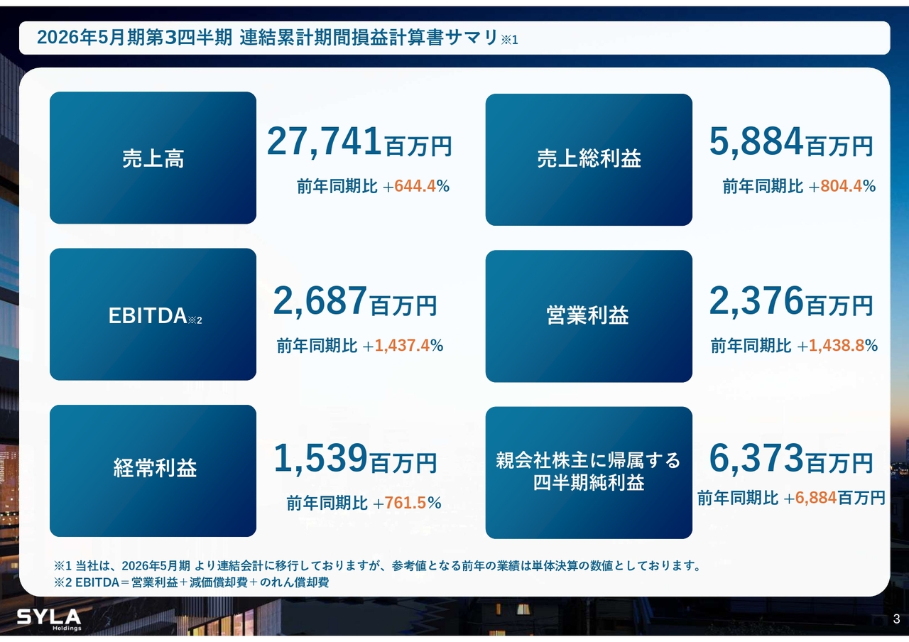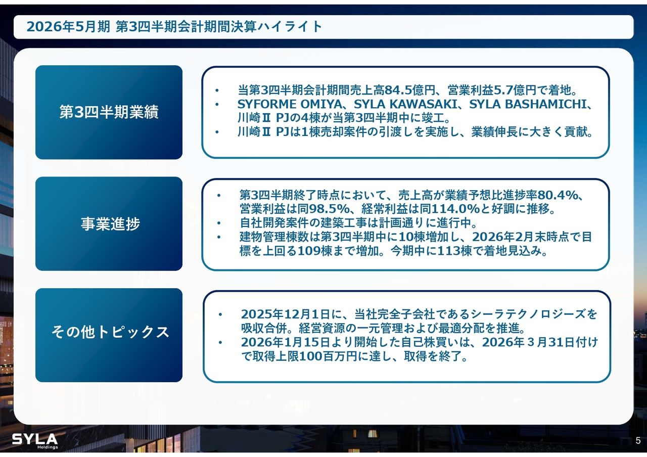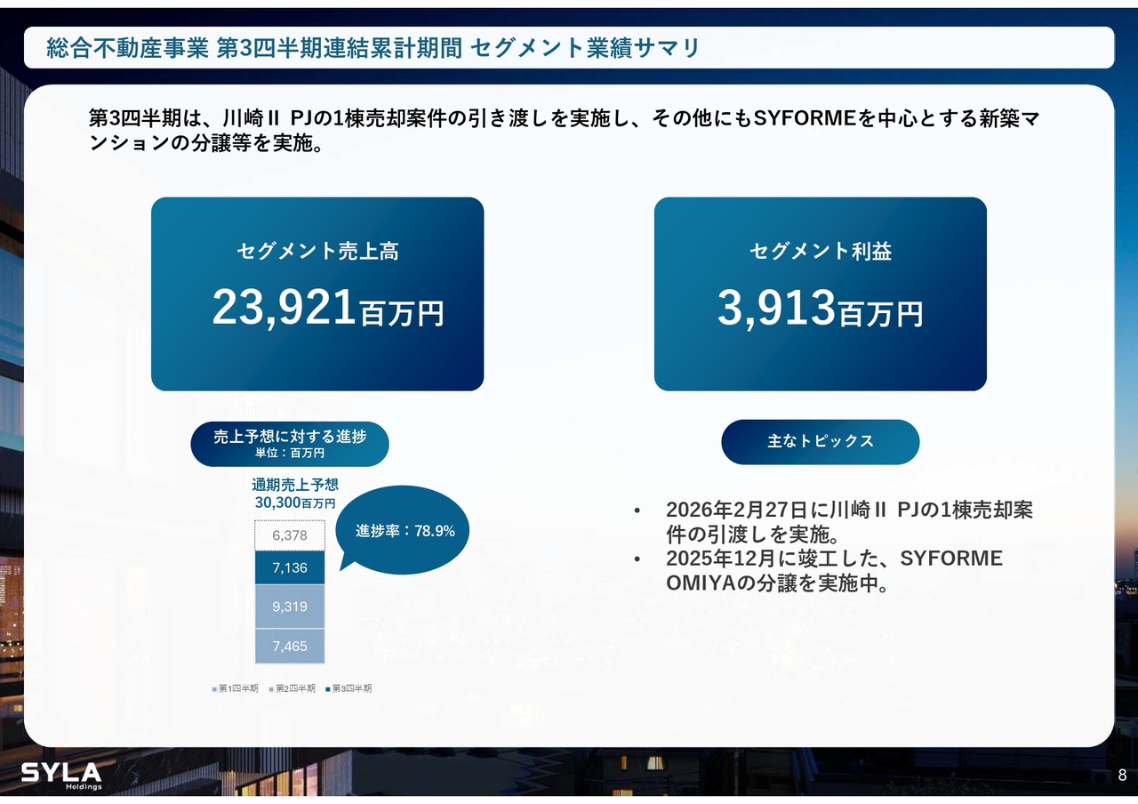 杉本:2026年5月期第3四半期会計期間については、売上高84億5,000万円、営業利益5億7,000万円で着地しました。「SYFORME OMIYA」「SYLA KAWASAKI」「SYLA BASHAMICHI」「川崎II PJ」の4棟が完成しています。そして、「川崎II PJ」は大手企業に1棟で売却したため、業績伸長に大きく貢献しました。