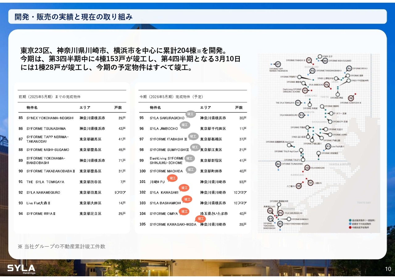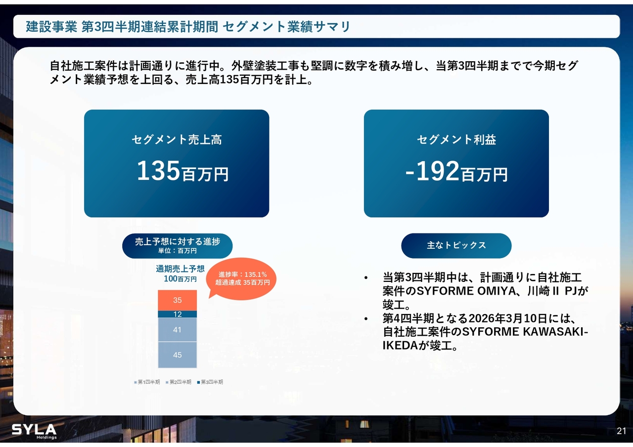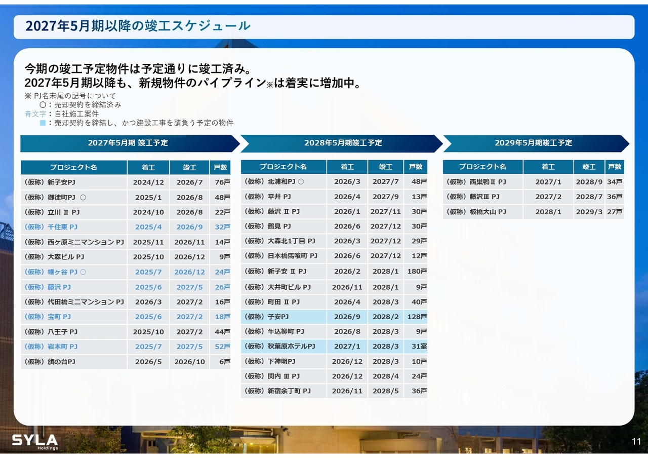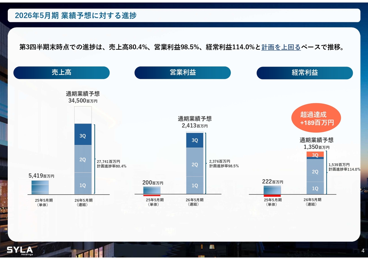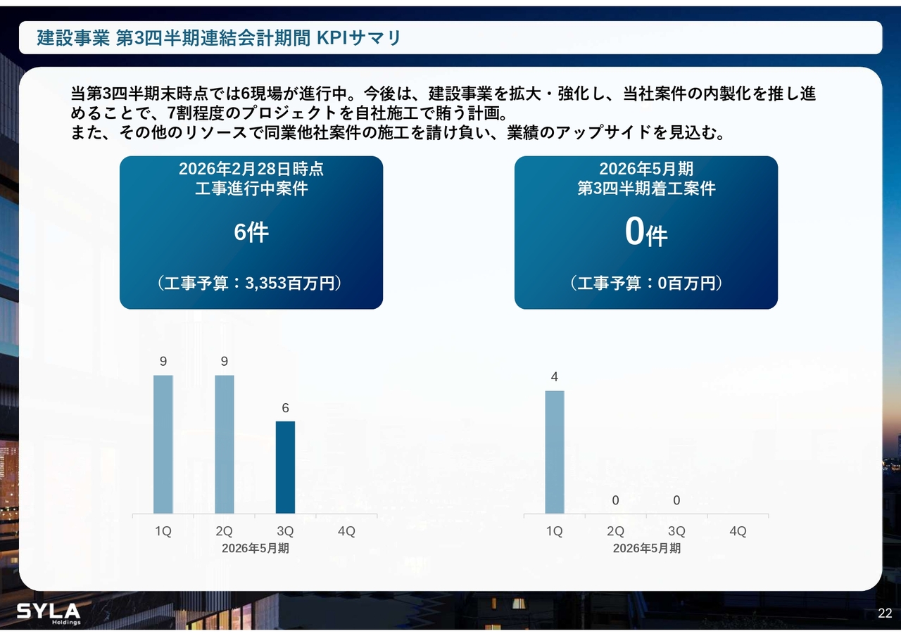 杉本:2026年5月期第3四半期会計期間については、売上高84億5,000万円、営業利益5億7,000万円で着地しました。「SYFORME OMIYA」「SYLA KAWASAKI」「SYLA BASHAMICHI」「川崎II PJ」の4棟が完成しています。そして、「川崎II PJ」は大手企業に1棟で売却したため、業績伸長に大きく貢献しました。
