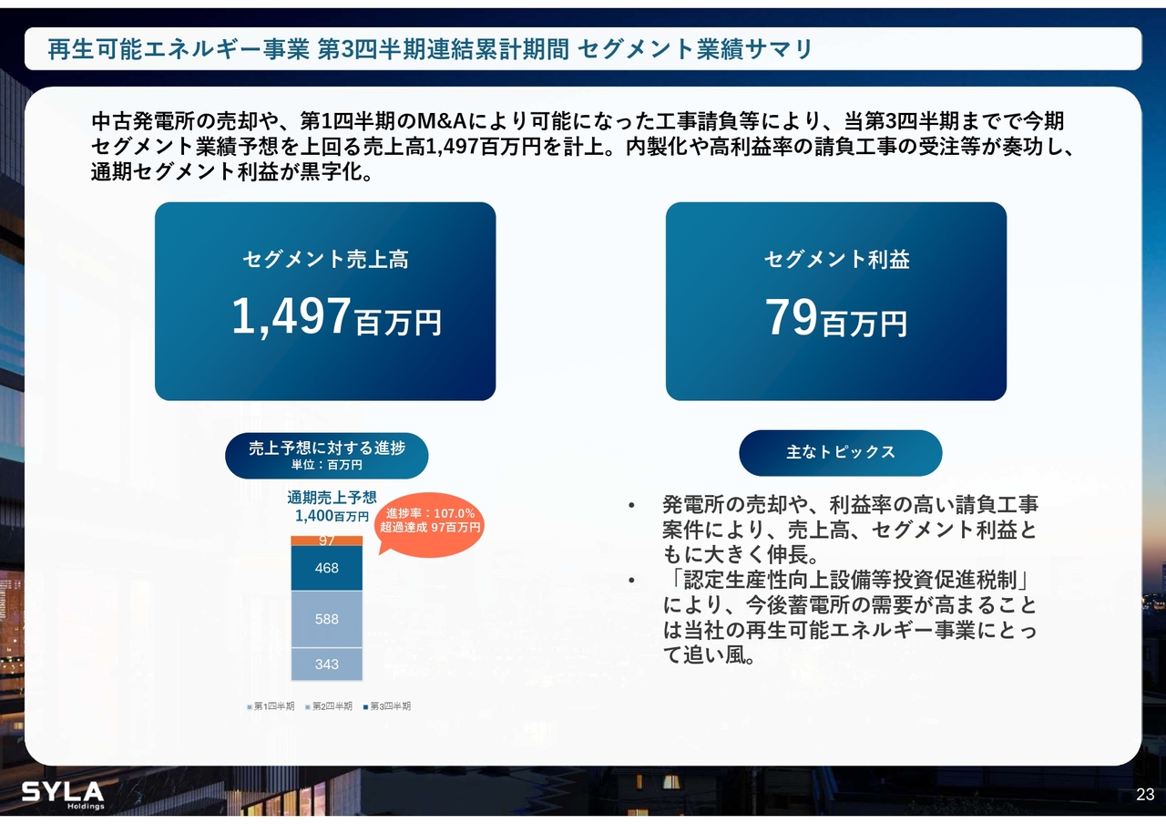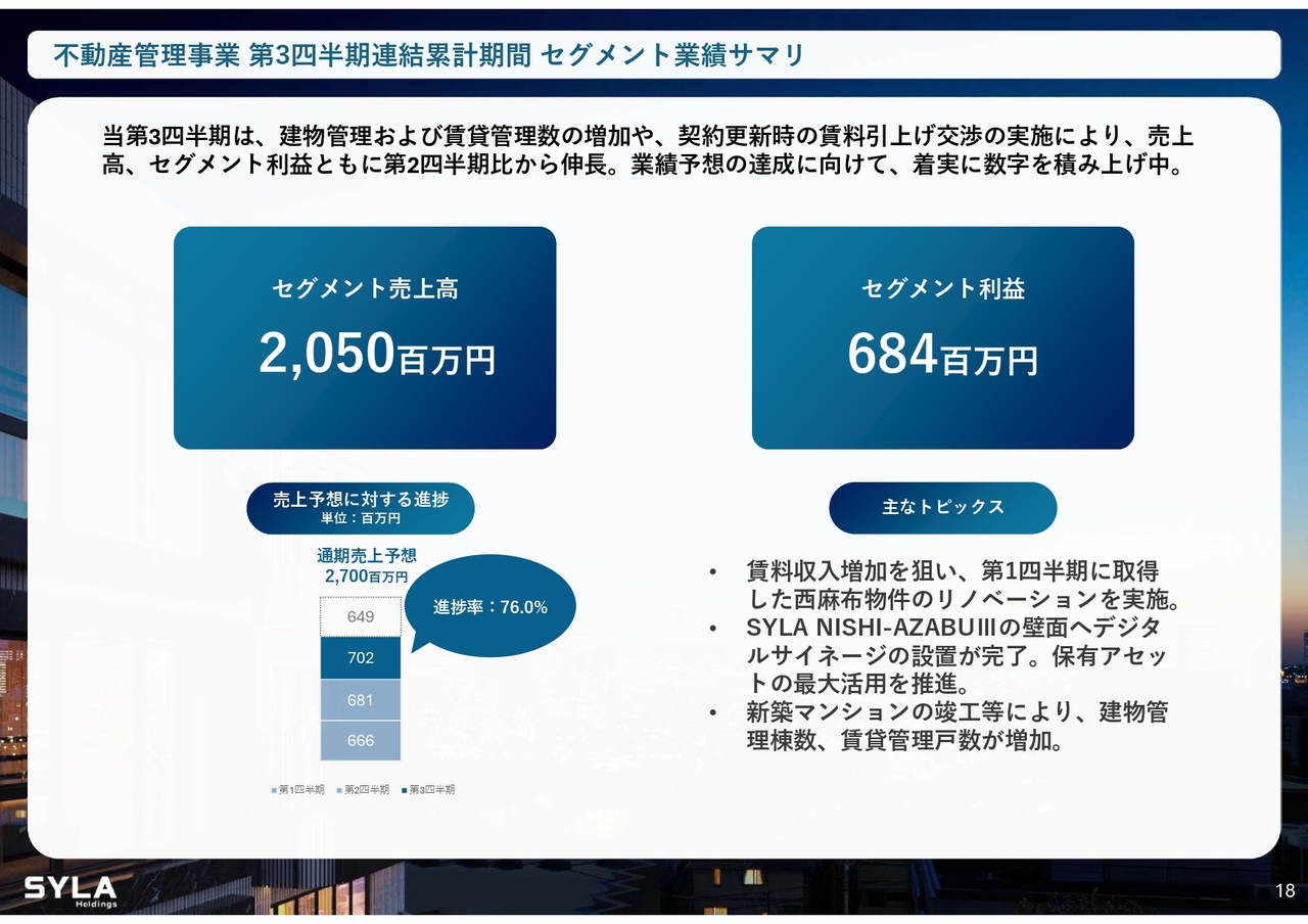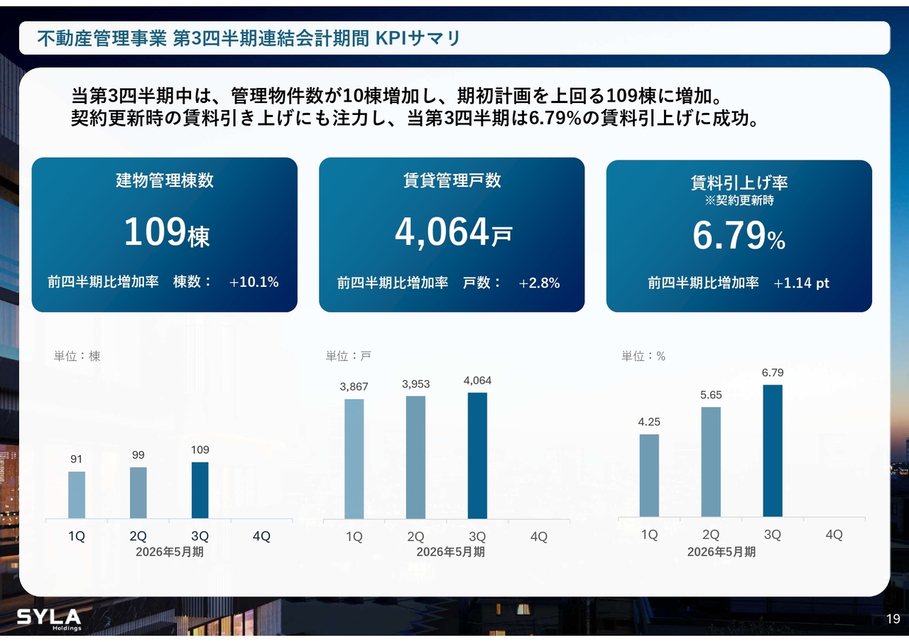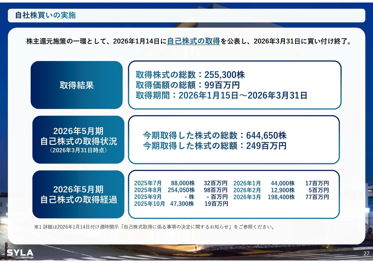 杉本:2026年5月期第3四半期会計期間については、売上高84億5,000万円、営業利益5億7,000万円で着地しました。「SYFORME OMIYA」「SYLA KAWASAKI」「SYLA BASHAMICHI」「川崎II PJ」の4棟が完成しています。そして、「川崎II PJ」は大手企業に1棟で売却したため、業績伸長に大きく貢献しました。