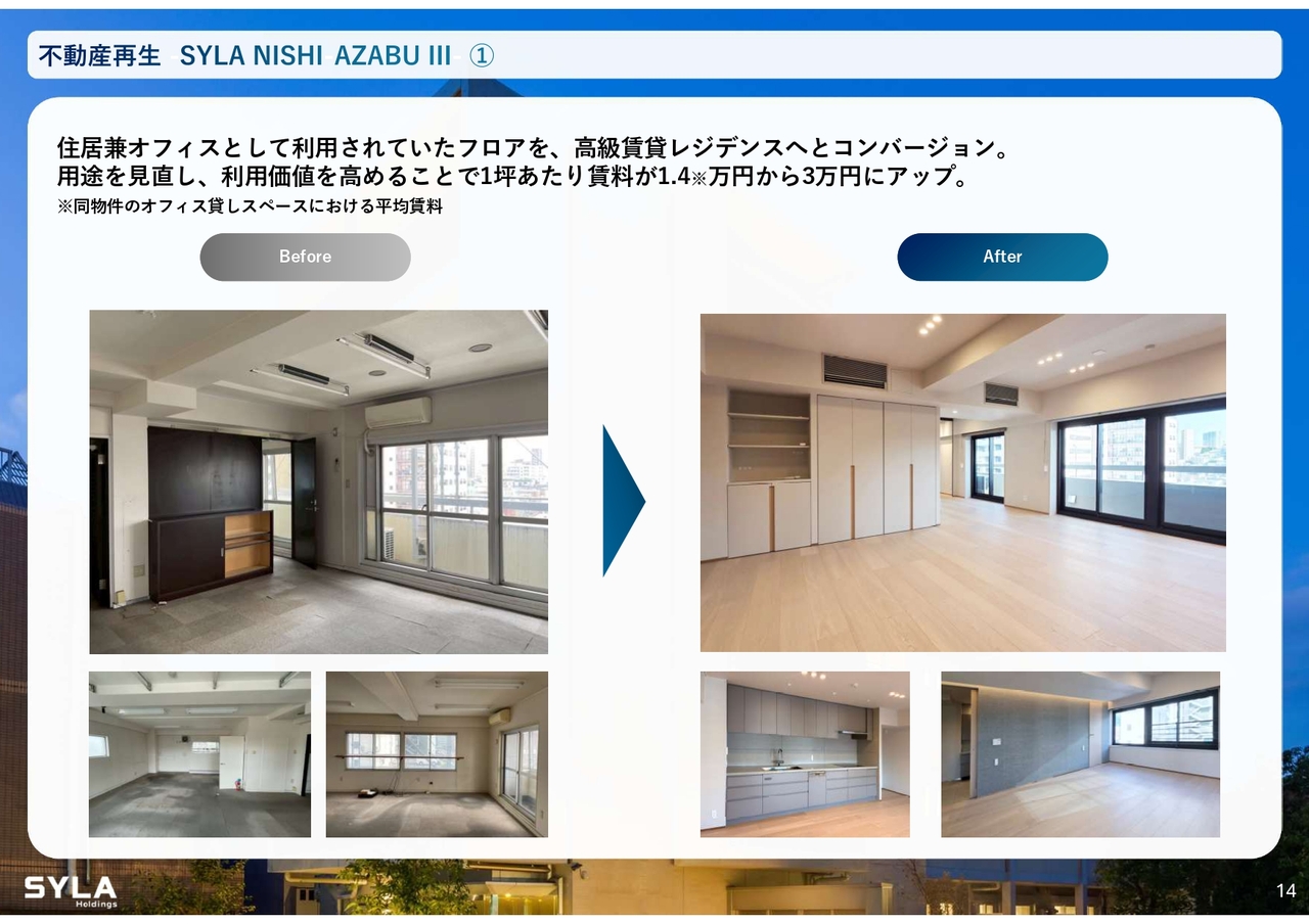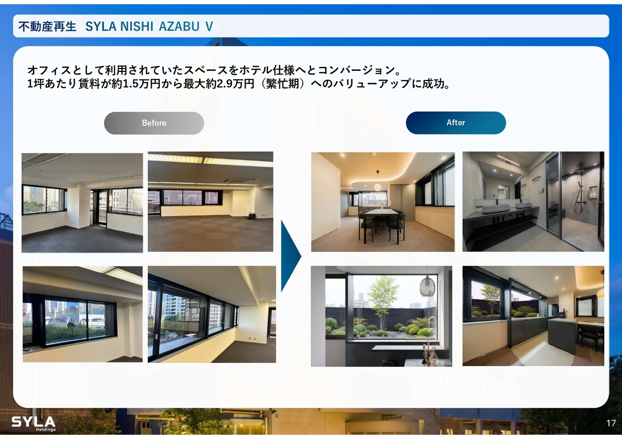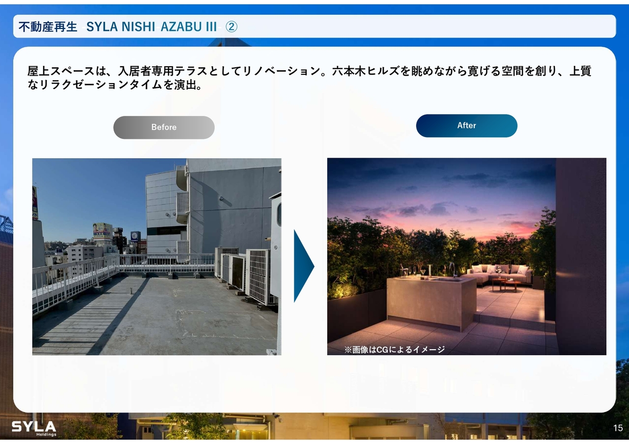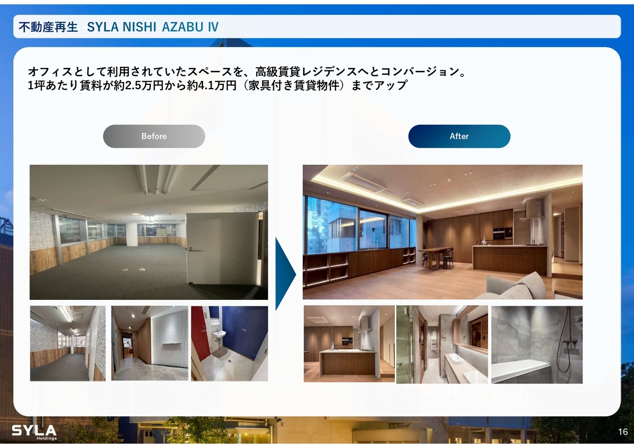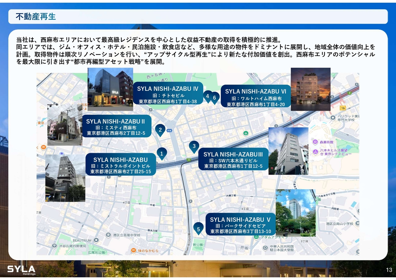 杉本:不動産再生事業についてです。我々は古いビルを取得し、西麻布エリアを中心に集中的な仕入れを行っています。先日、6棟目の物件を仕入れました。