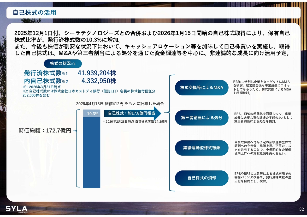 杉本:自己株式は積極的に取得を進めています。これは、現在の株価が依然として割安であると考えていることが背景にあります。取得した自己株式の簿価は現時点で20パーセント以上、30パーセントに近づいてきました。