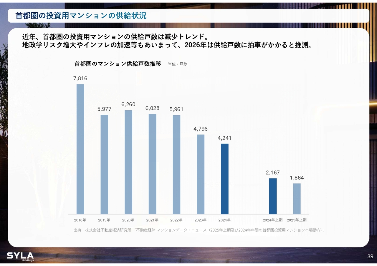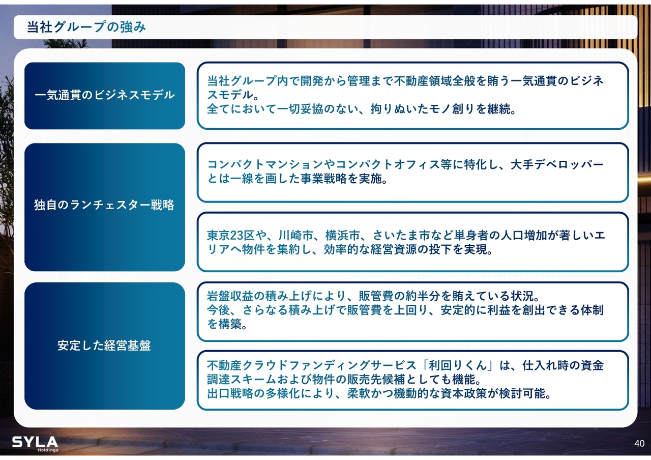 杉本:都度、構成比率は変化しています。ただし、「THE SYLA」という高級路線は、現在仕入れを1件のみ行っています。高級マンション市場が崩壊しているため、ここにあまり力を入れ過ぎないでよかったと思います。それでも3億円以内のもので、極端なものは作っていません。したがって、我々としては、ここは堅実に進められると考えています。