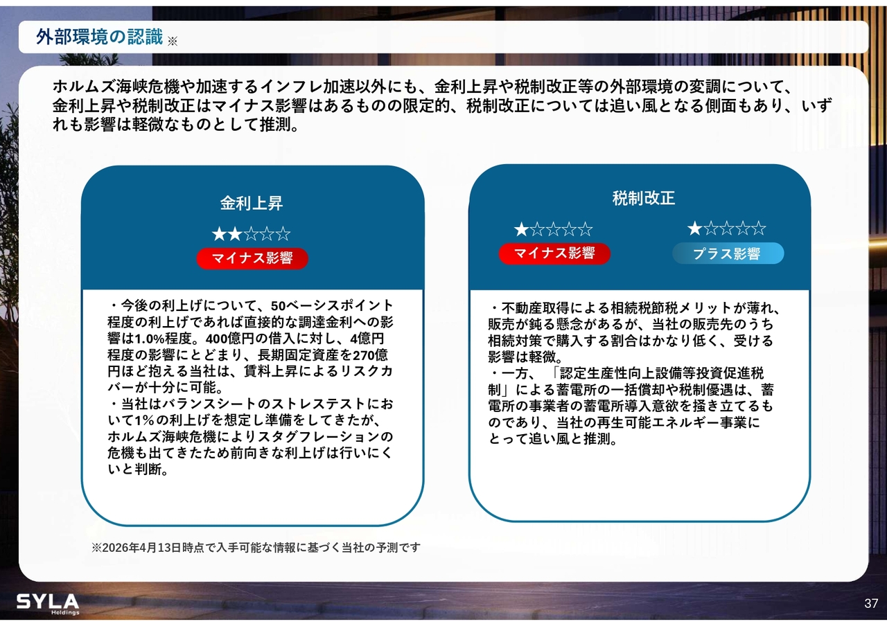 杉本:金利上昇については、当然影響としてはマイナスです。ただし、このような状況を考慮し、当社では最大1パーセントの上昇を見込んでいましたが、現時点では0.25パーセント程度と考えています。