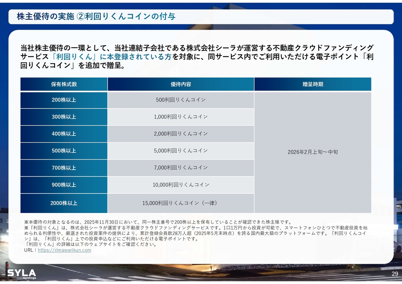 株主優待の実施 ②利回りくんコインの付与