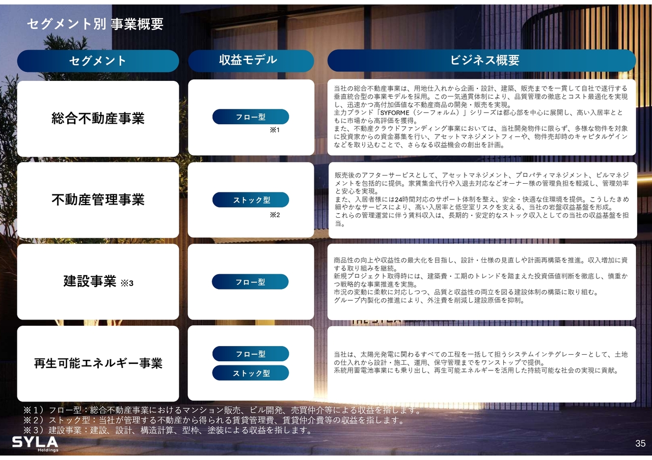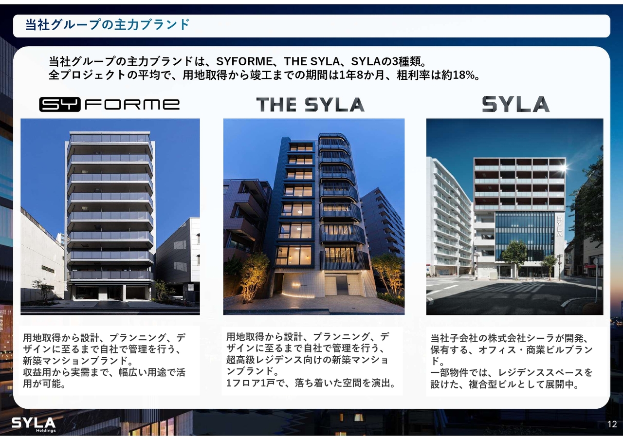 杉本:当社グループの主力ブランドは、「SYFORME」シリーズと「THE SYLA」シリーズおよび「SYLA」シリーズの3ブランドです。構成はコンパクトマンション、高級マンション、複合ミックスの開発となっています。
