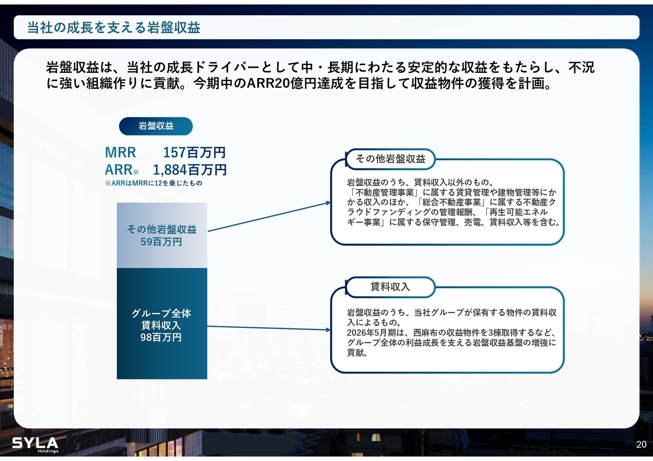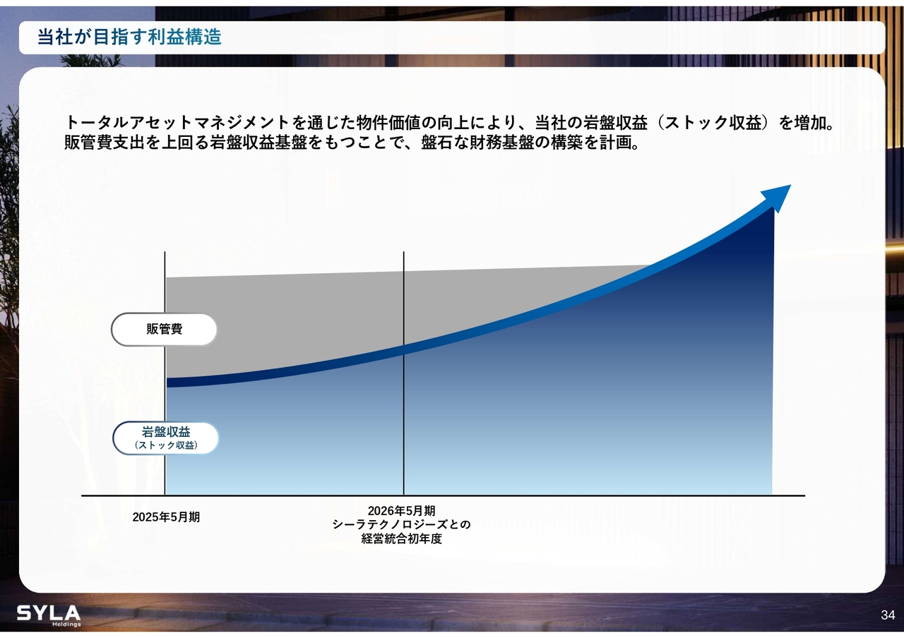杉本:引き続き、当社が目指す利益構造についてご説明します。岩盤収益がいよいよ20億円を超えてくる見込みです。当社は約200名の小規模な会社ですので、販管費をすべて岩盤収益で賄うことを目標としています。