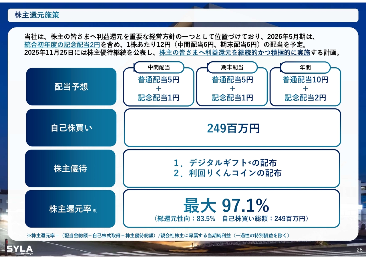 杉本:株主還元についてです。こちらに変更はなく、株主還元率は最大97.1パーセントとなっています。