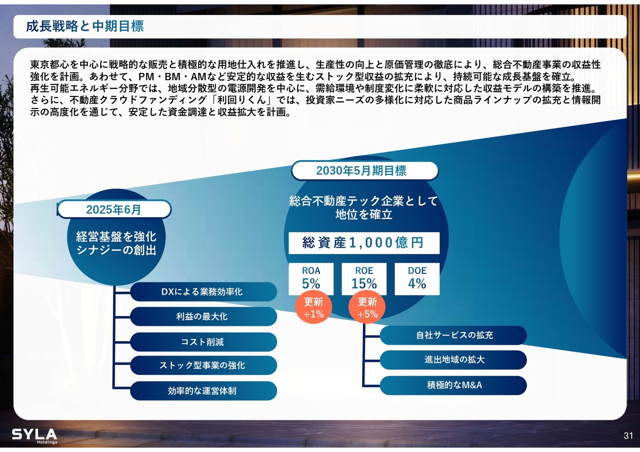 杉本:成長戦略です。こちらで数字を少し更新しました。事業の順調な成長と進捗に伴い、ROAをプラス1パーセント、ROEをプラス5パーセントに更新しました。