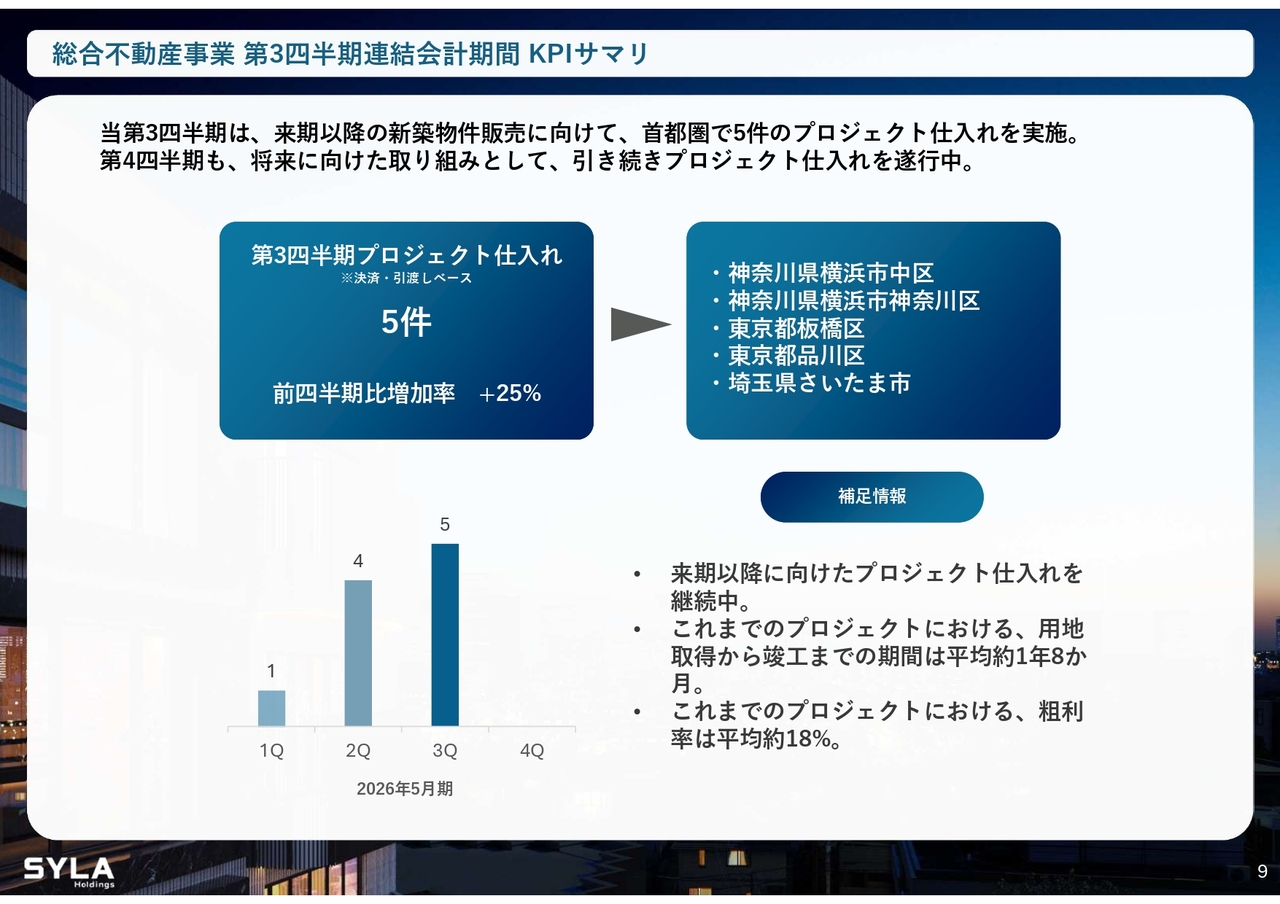 杉本:総合不動産事業については、第3四半期中に5件の仕入れを行いました。仕入れた地域は、横浜市中区、横浜市神奈川区、東京都板橋区、東京都品川区、埼玉県さいたま市です。