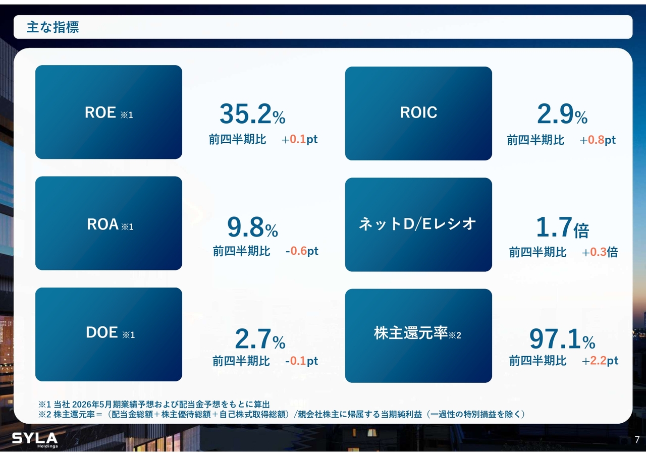 また、DOEは2.7パーセント、ROICは2.9パーセント、ネットD/Eレシオは1.7倍となっています。株主還元率は自己株買いも含めて97.1パーセントで、以前からお伝えしているとおり、株主還元率として満額回答を初めから意識し、しっかりと達成できたと考えています。