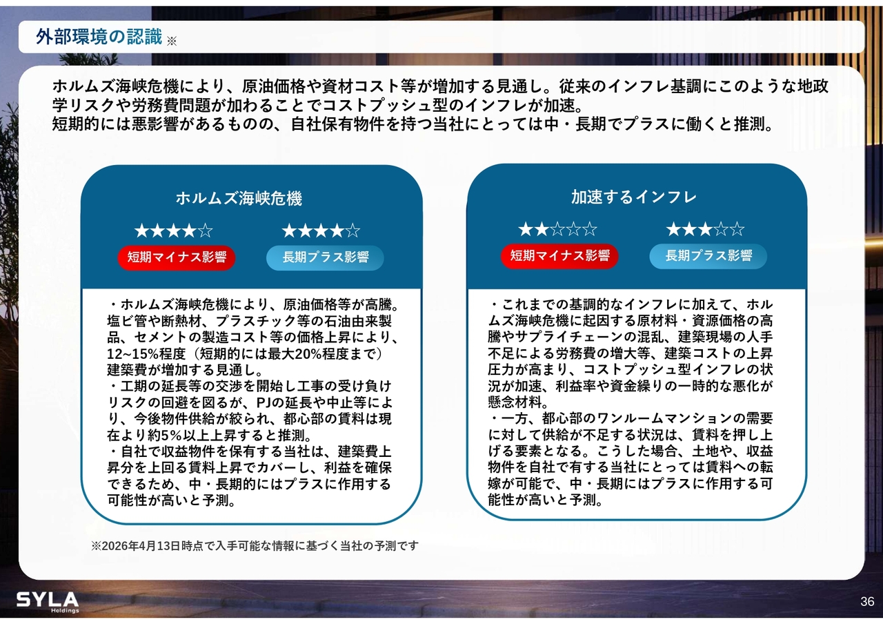 ホルムズ海峡の紛争に関しては、出来高次第で工事をお受けする状況であるとお伝えしましたが、このような状況においても困っているデベロッパー各社の支援ができるのではないかと考えています。これにより、当社は利益率および在庫回転率を向上させながら、事業期間を短縮することにもつなげられると考えています。