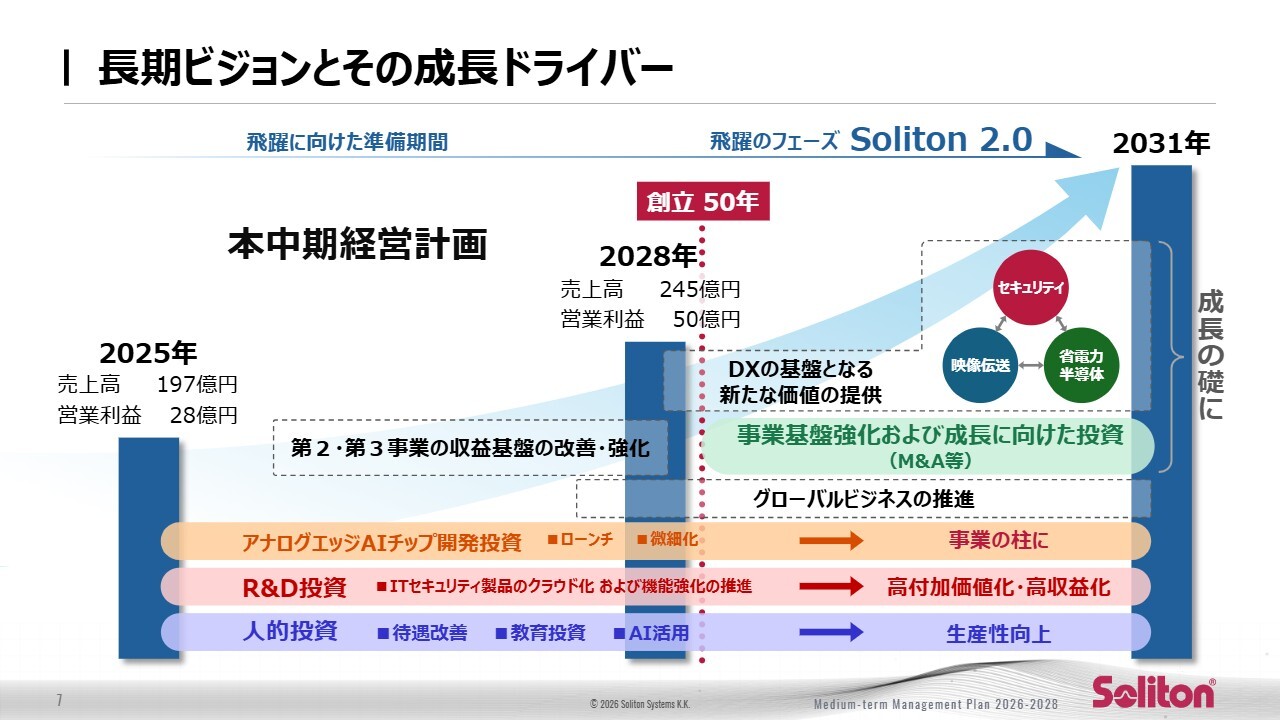 こちらのスライドは、中期計画をさらに先取りし、より長期的な成長ストーリーを示しています。前のスライドでご説明したとおり、2028年度には売上245億円、営業利益50億円を見込んでおり、この段階で投資事業の収益化を完了させ、収益性と事業基盤の強化を確実に進めます。