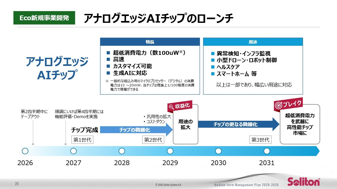 このチップは、異常検知やインフラ監視、小型ドローンやロボット制御、ヘルスケア、スマートホームなど、常時稼働の省電力が価値となる市場での横展開が可能です。量産化を通じて、Eco新規事業開発の成長を牽引する主役へと成長させていく方針です。