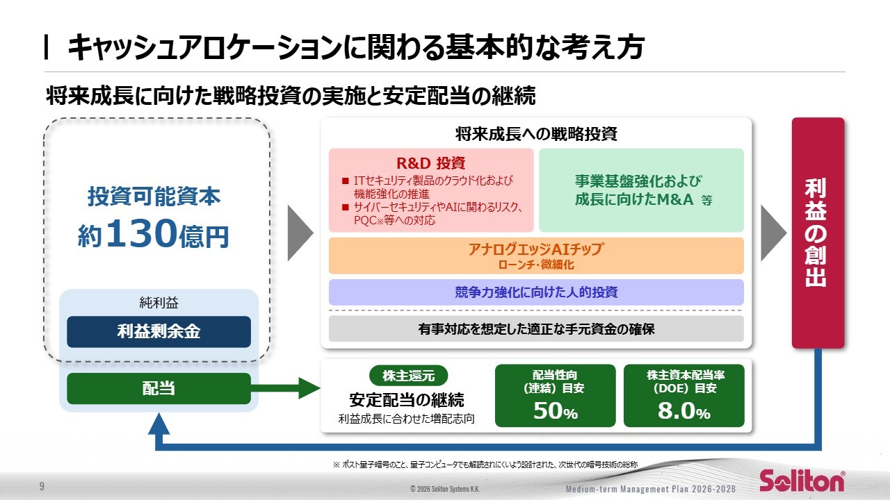 一方、新規事業や研究開発については、将来の成長ドライバーとして引き続き投資を行いながら、収益化のタイミングと投資効率を厳格に管理します。これらの取り組みを通じて、利益成長と資本効率の両立を図り、持続的な企業価値の向上を目指していきます。