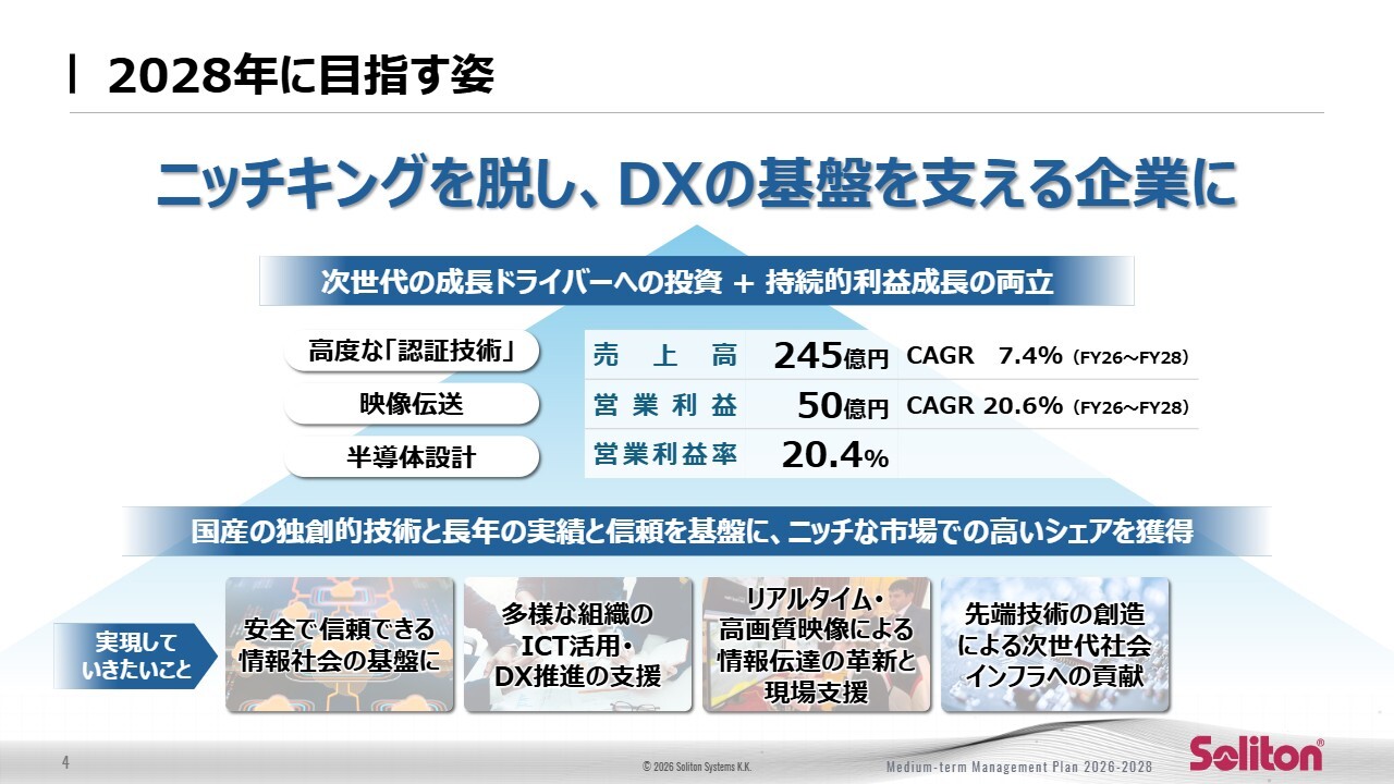 本動画では、ソリトンシステムズの2026年度から2028年度までの中期経営計画についてご説明します。私たちがこの3年間で何に集中し、どのように収益成長と資本効率の両立を図っていくのか、その全体像について順を追ってお話ししていきます。