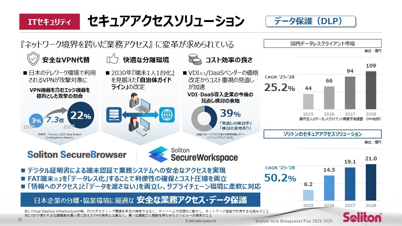 その中で、当社のセキュアアクセスソリューションは、年平均50パーセントの成長を計画しています。この背景には、VDIやDaaSの見直し機運の高まりや、VPN機器を狙ったサイバー攻撃の急増があります。